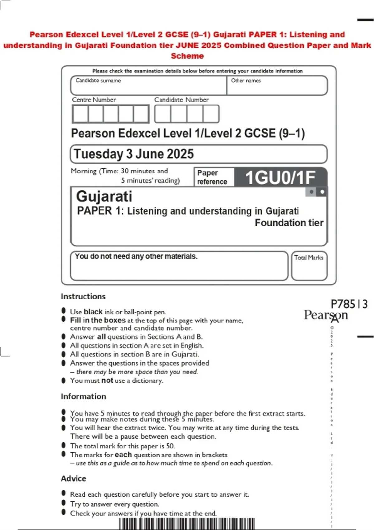 Pearson Edexcel Level 1/Level 2 GCSE (9–1) Gujarati PAPER 1: Listening and understanding in Gujarati Foundation tier JUNE 2025 Combined Question Paper and Mark Scheme
