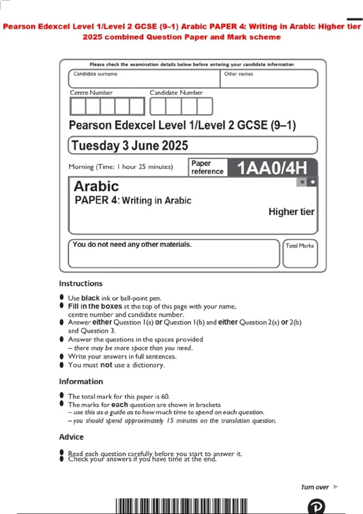 Pearson Edexcel Level 1/Level 2 GCSE (9–1) Arabic PAPER 4: Writing in Arabic Higher tier 2025 combined Question Paper and Mark scheme