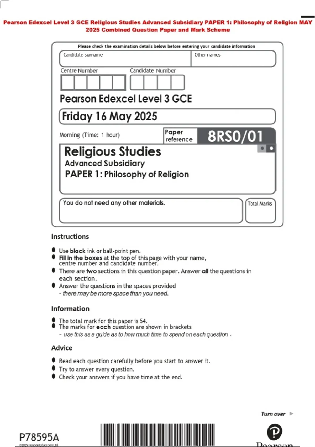 Pearson Edexcel Level 3 GCE Religious Studies Advanced Subsidiary PAPER 1: Philosophy of Religion MAY 2025 Combined Question Paper and Mark Scheme