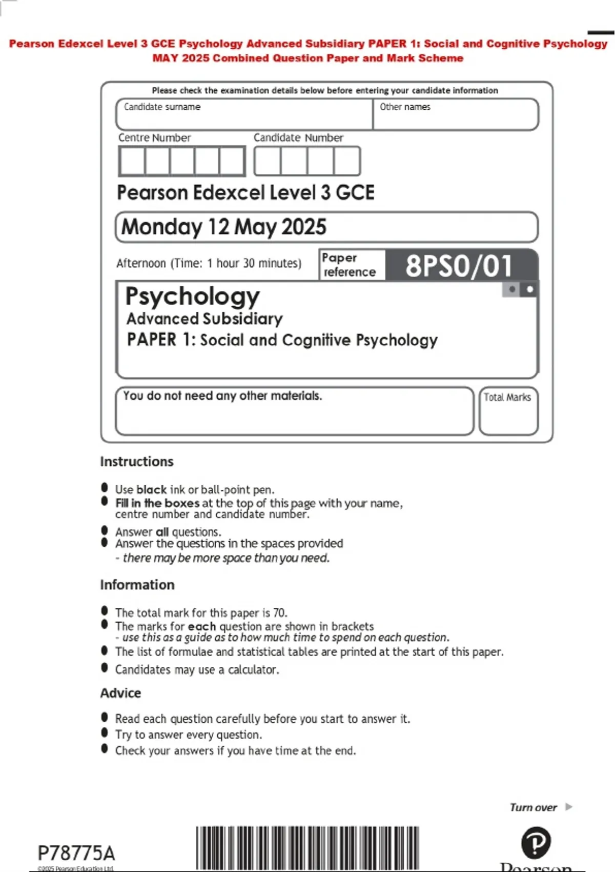 Pearson Edexcel Level 3 GCE Psychology Advanced Subsidiary PAPER 1: Social and Cognitive Psychology MAY 2025 Combined Question Paper and Mark Scheme