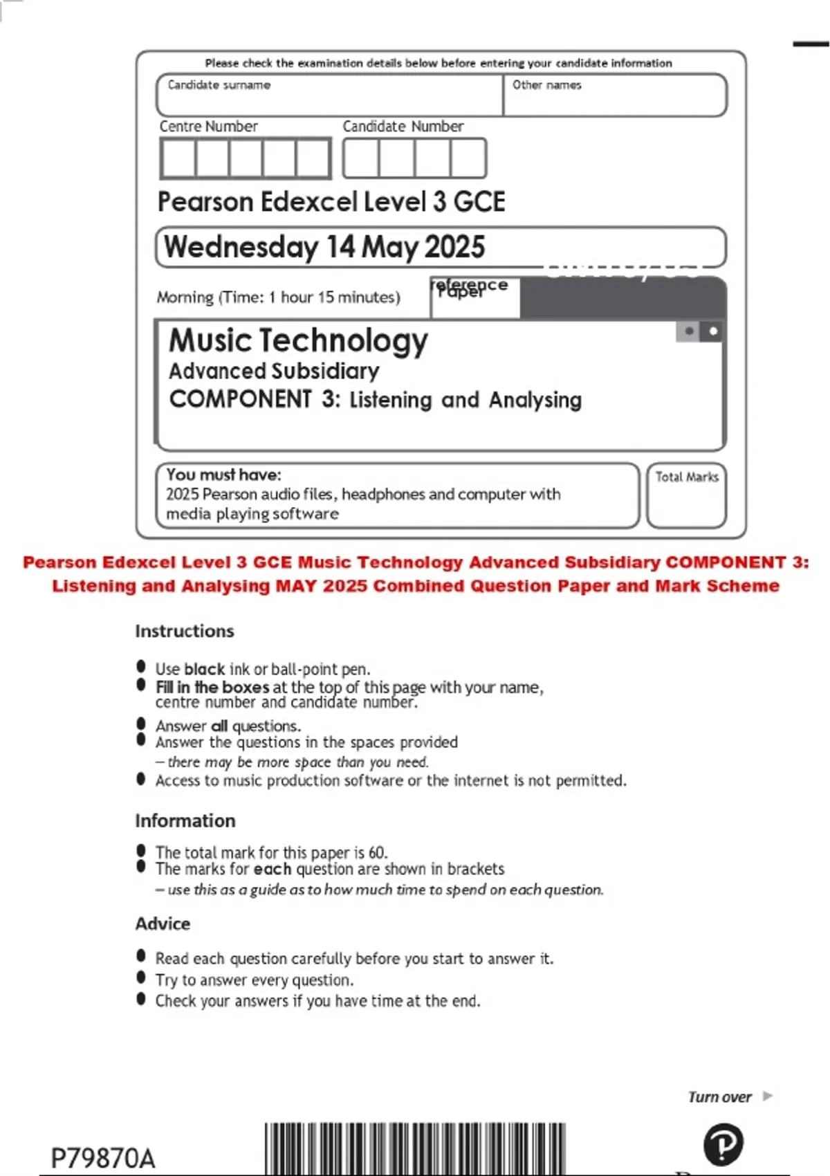 Pearson Edexcel Level 3 GCE Music Technology Advanced Subsidiary COMPONENT 3: Listening and Analysing MAY 2025 Combined Question Paper and Mark Scheme