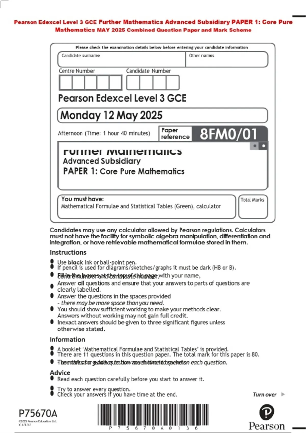 Pearson Edexcel Level 3 GCE Further Mathematics Advanced Subsidiary PAPER 1: Core Pure Mathematics MAY 2025 Combined Question Paper and Mark Scheme