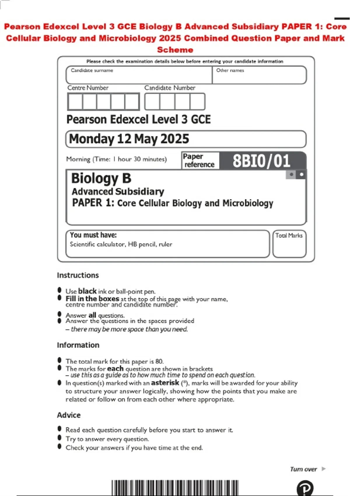 Pearson Edexcel Level 3 GCE Biology B Advanced Subsidiary PAPER 1: Core Cellular Biology and Microbiology 2025 Combined Question Paper and Mark Scheme