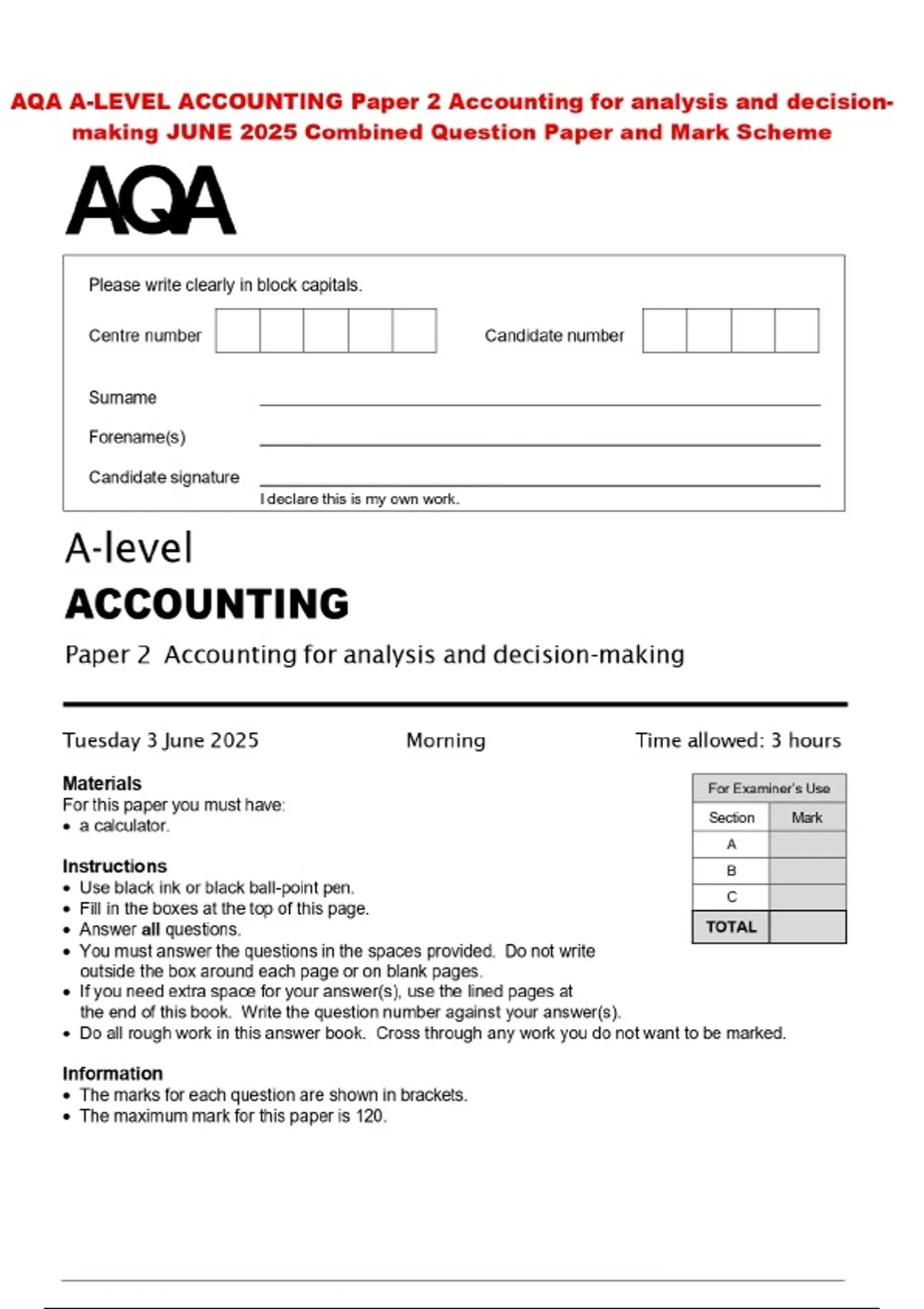 BUNDLE:::AQA A-LEVEL ACCOUNTING 2025 Combined Question Paper and Mark Scheme