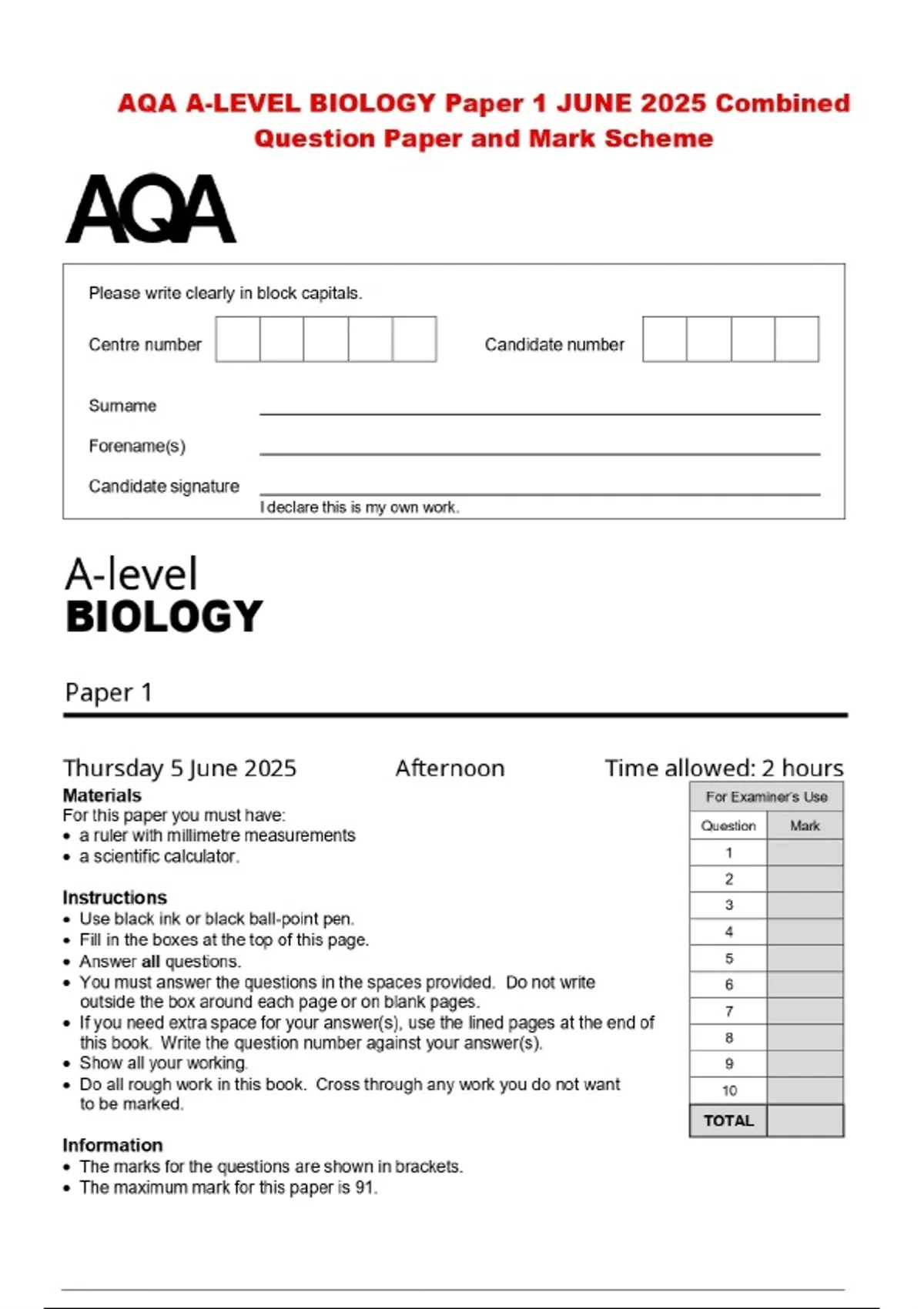 AQA A-LEVEL BIOLOGY Paper 1 JUNE 2025 Combined Question Paper and Mark Scheme