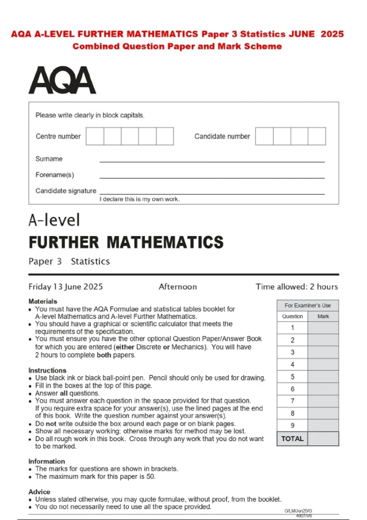 AQA A-LEVEL FURTHER MATHEMATICS Paper 3 Statistics JUNE 2025 Combined Question Paper and Mark Scheme
