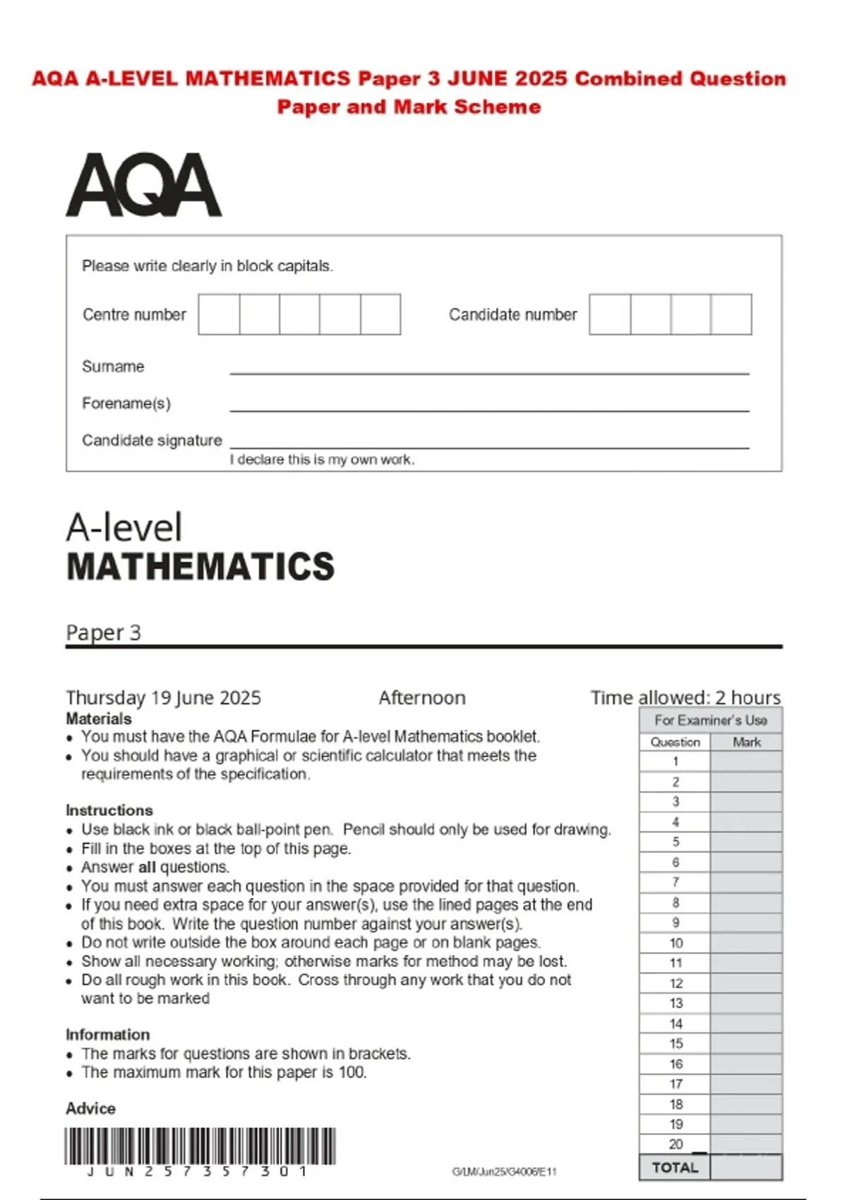 AQA A-LEVEL MATHEMATICS Paper 3 JUNE 2025 Combined Question Paper and Mark Scheme