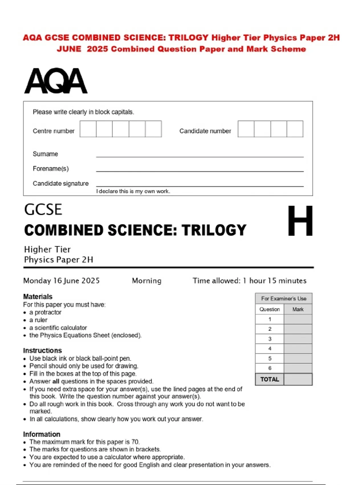 AQA GCSE COMBINED SCIENCE: TRILOGY Higher Tier Physics Paper 2H JUNE 2025 Combined Question Paper and Mark Scheme