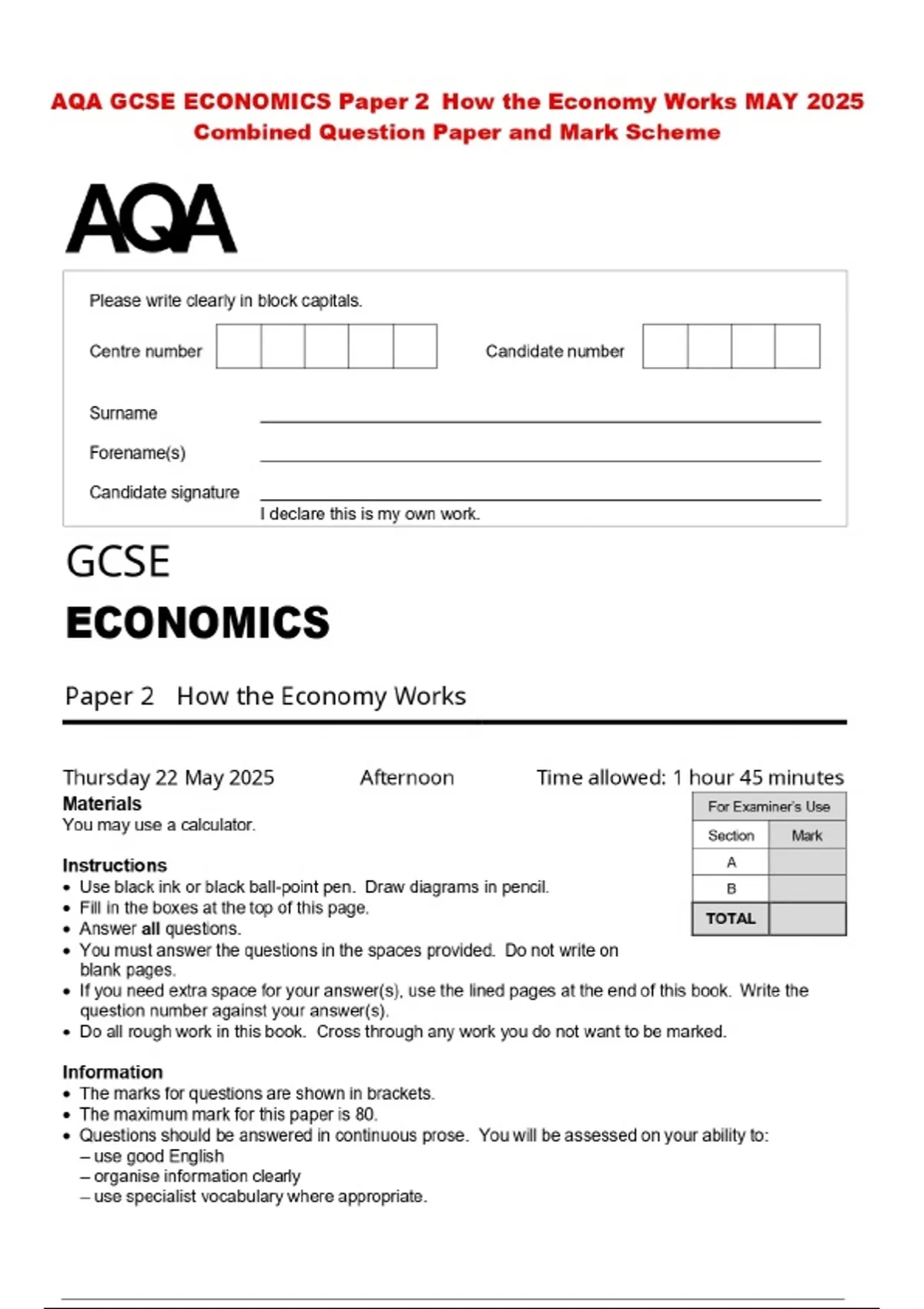 AQA GCSE ECONOMICS Paper 2 How the Economy Works MAY 2025 Combined Question Paper and Mark Scheme