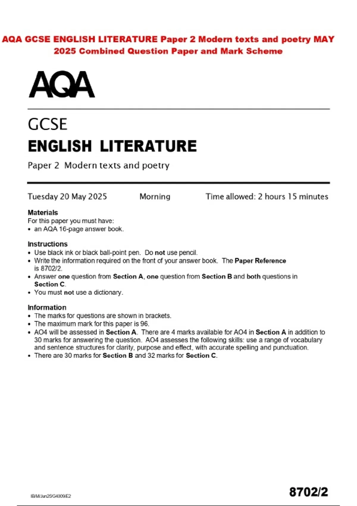 AQA GCSE ENGLISH LITERATURE Paper 2 Modern texts and poetry MAY 2025 Combined Question Paper and Mark Scheme