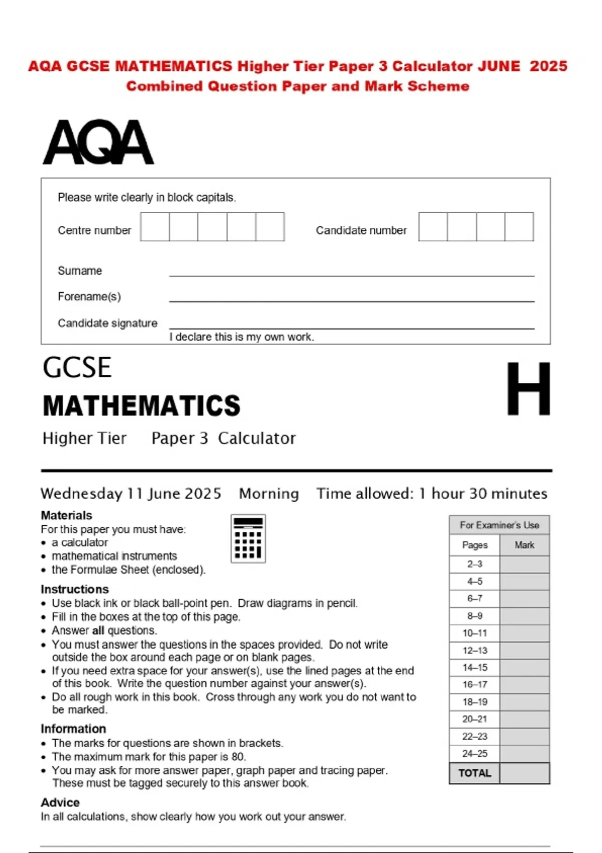 AQA GCSE MATHEMATICS Higher Tier Paper 3 Calculator JUNE 2025 Combined Question Paper and Mark Scheme