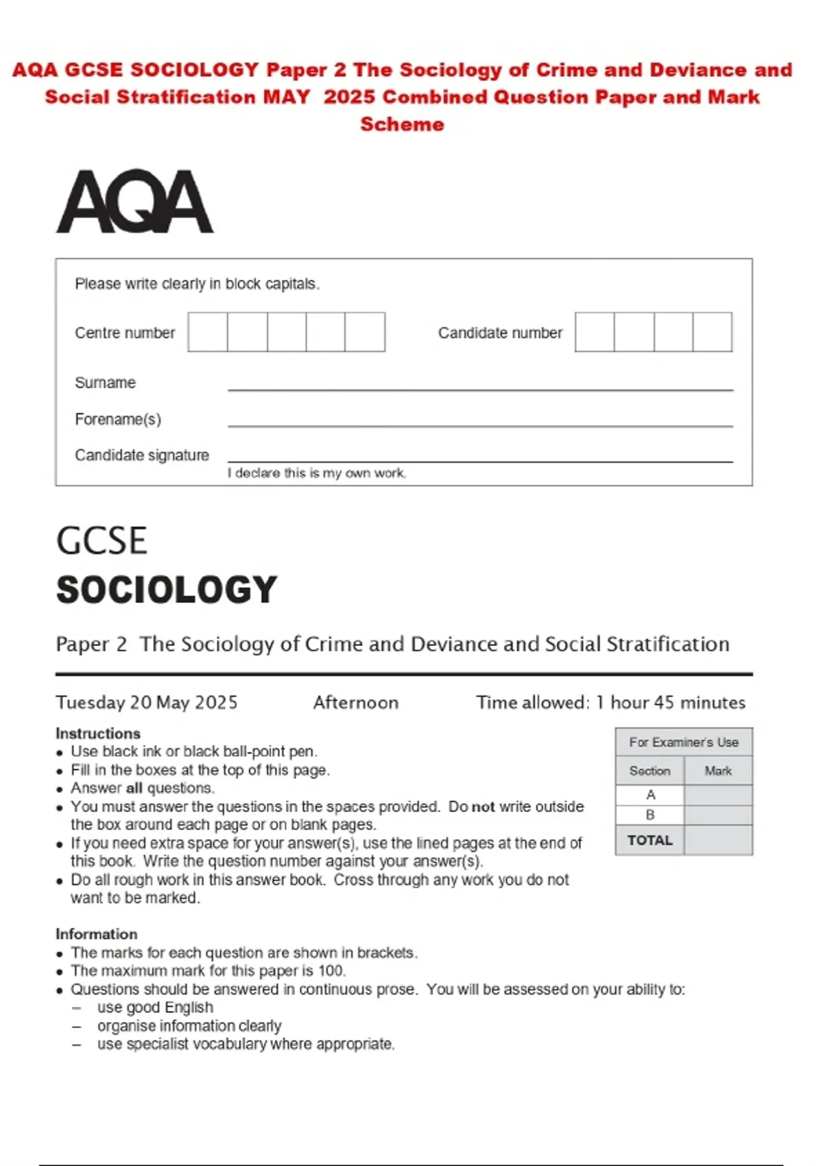 AQA GCSE SOCIOLOGY Paper 2 The Sociology of Crime and Deviance and Social Stratification MAY 2025 Combined Question Paper and Mark Scheme