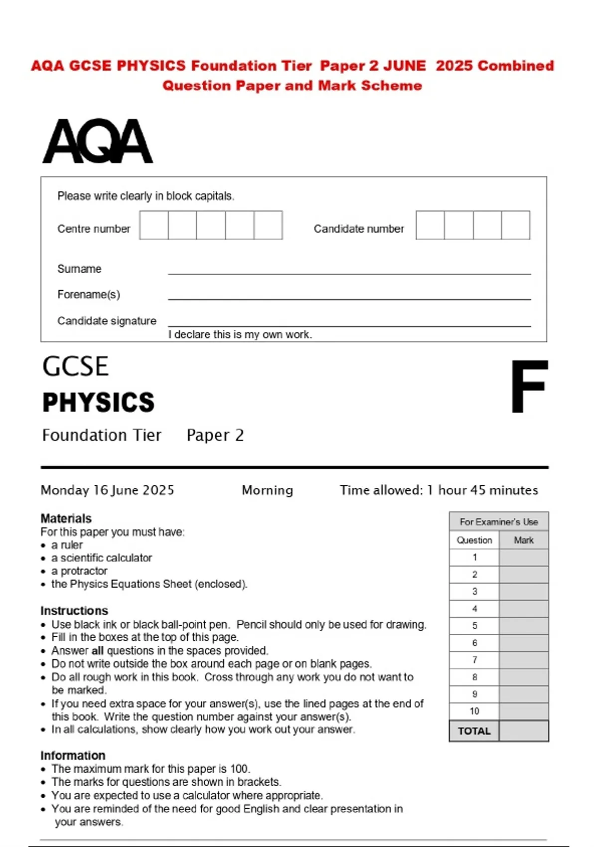 AQA GCSE PHYSICS Foundation Tier Paper 2 JUNE 2025 Combined Question Paper and Mark Scheme
