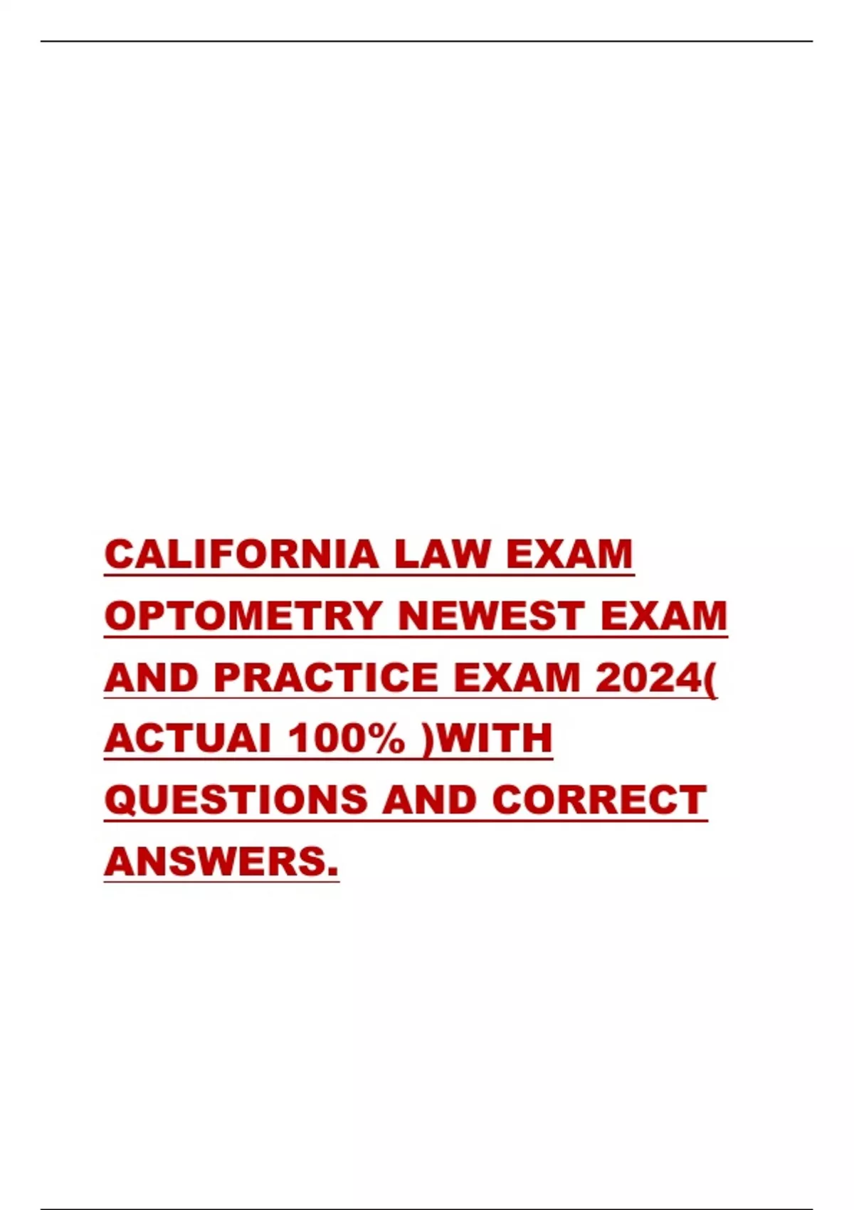 California Chiropractic Law Exam (CCLE) Prep 2025/2026 – Final Exam Study Guide & Practice Questions 2 Exam (elaborations) CALIFORNIA LAW EXAM OPTOMETRY NEWEST EXAM AND PRACTICE EXAM 2024( ACTUAI 100% )WITH QUESTIONS AND CORRECT ANSWERS. 3 Exam (elaborations) California Pre-Licensing Education – Life, Accident & Health Insurance Course 2025 4 Ex