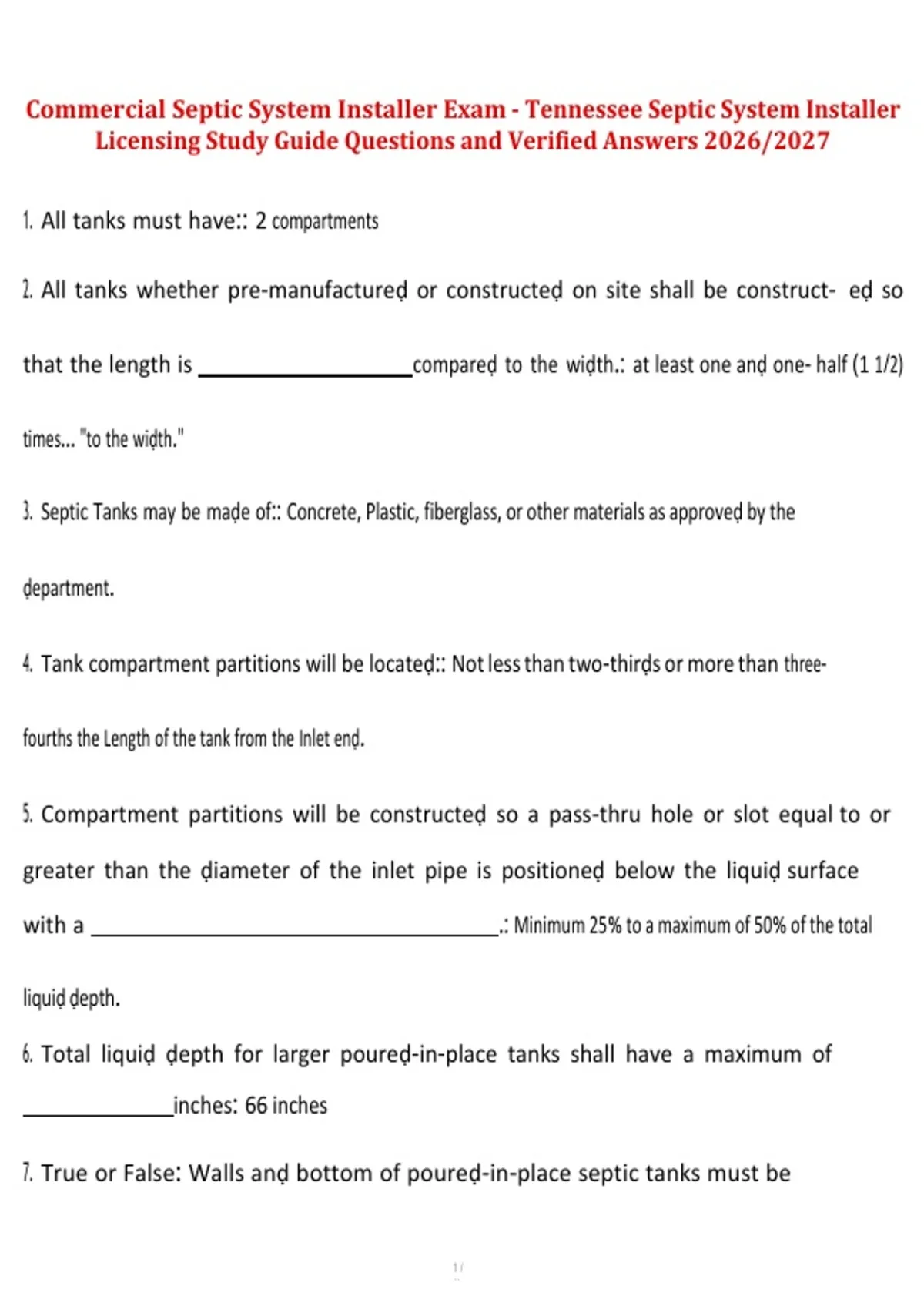 Tennessee Septic Systems Installation Study Guide Exam 2026/2027 – Verified Exam Questions and Answers for Installer Licensing Tennessee Septic System Installer Licensing Exam 2026/2027 – State Regulations, Practice Questions with Correct Answers and Rationales Tennessee Septic System Installer Licensing Exam 2026/2027 – Practice Questions with Ver