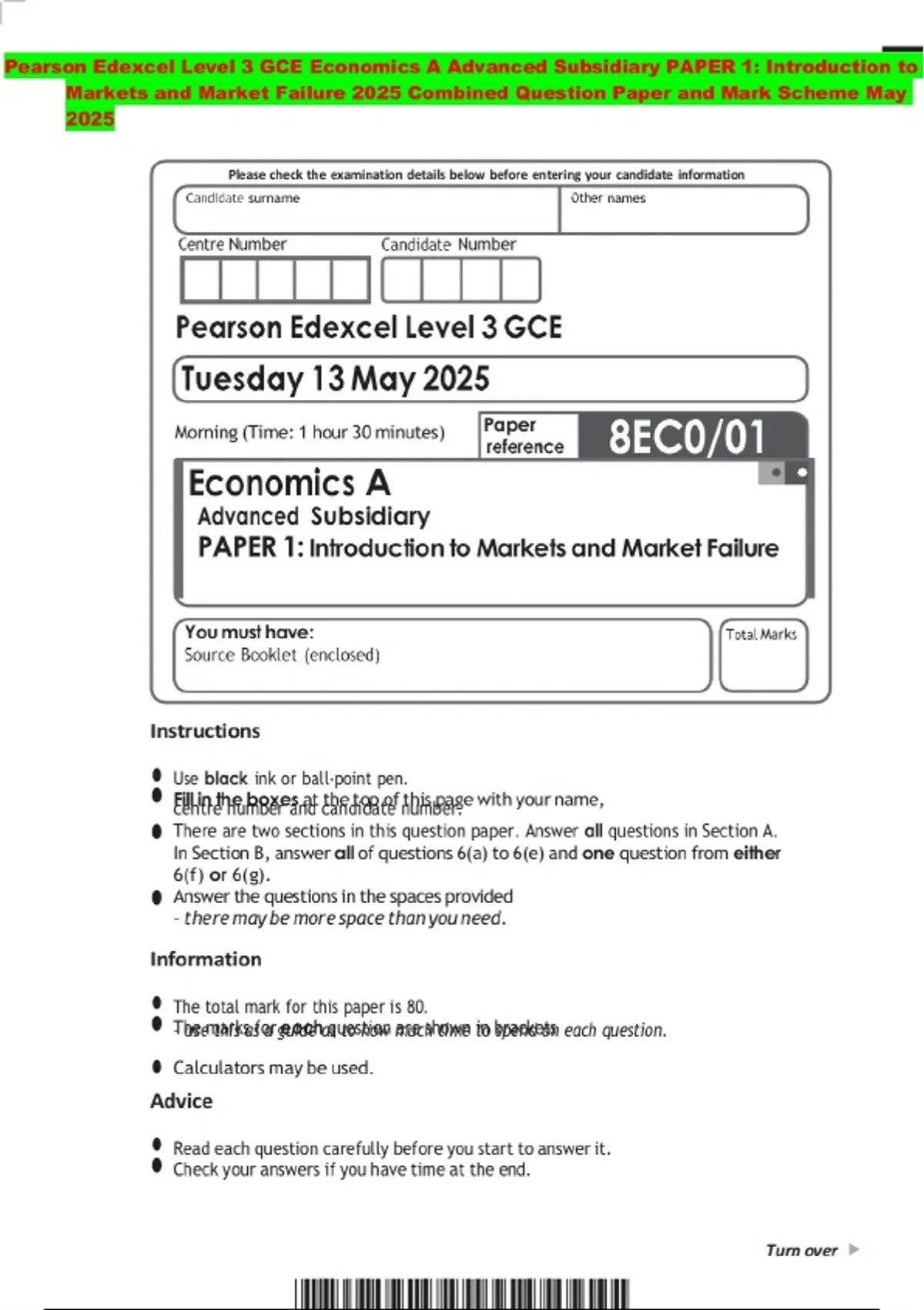 Pearson Edexcel Level 3 GCE Economics A Advanced Subsidiary PAPER 1: Introduction to Markets and Market Failure 2025 Combined Question Paper and Mark Scheme May 2025