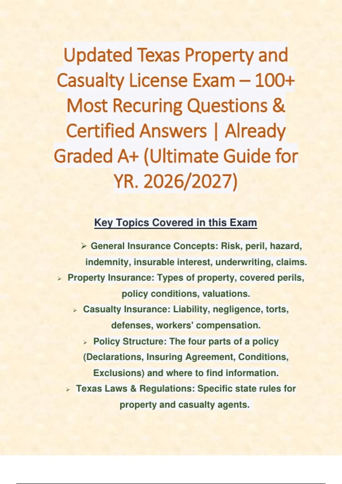 1 Exam (elaborations) Updated Texas Property and Casualty Insurance Exam – 400+ Questions & Certified Answers | Already Graded A+ (Ultimate Guide for YR. 2026/2027) 2 Exam (elaborations) Updated Texas Property and Casualty License Exam – 100+ Most Recuring Questions & Certified Answers | Already Graded A+ (Ultimate Guide for YR. 2026/2027)
