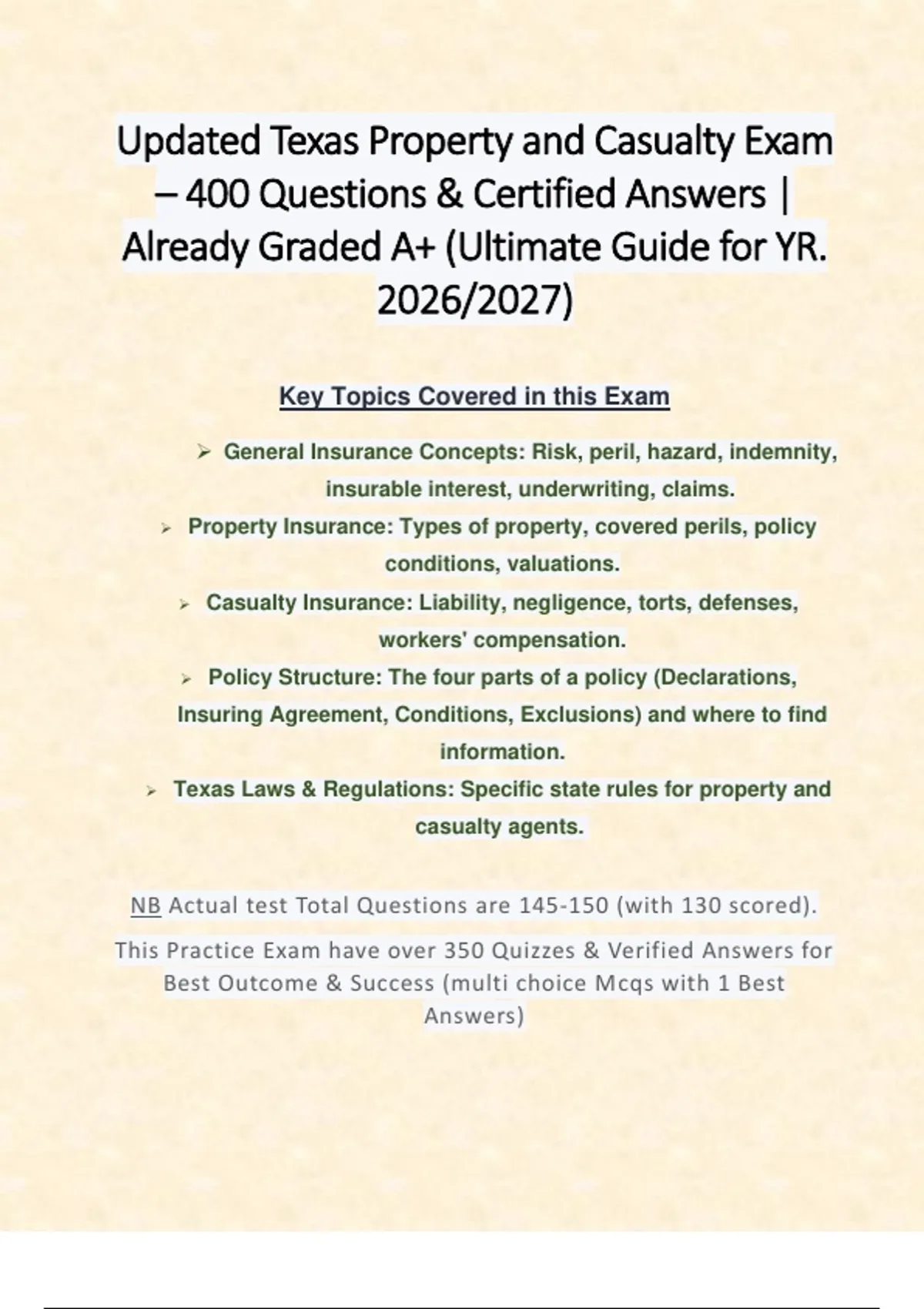 1 Exam (elaborations) Updated Texas Property and Casualty Exam – 400 Questions & Certified Answers | Already Graded A+ (Ultimate Guide for YR. 2026/2027) 2 Exam (elaborations) Updated Texas Property and Casualty License Exam – 100+ Most Recuring Questions & Certified Answers | Already Graded A+ (Ultimate Guide for YR. 2026/2027)