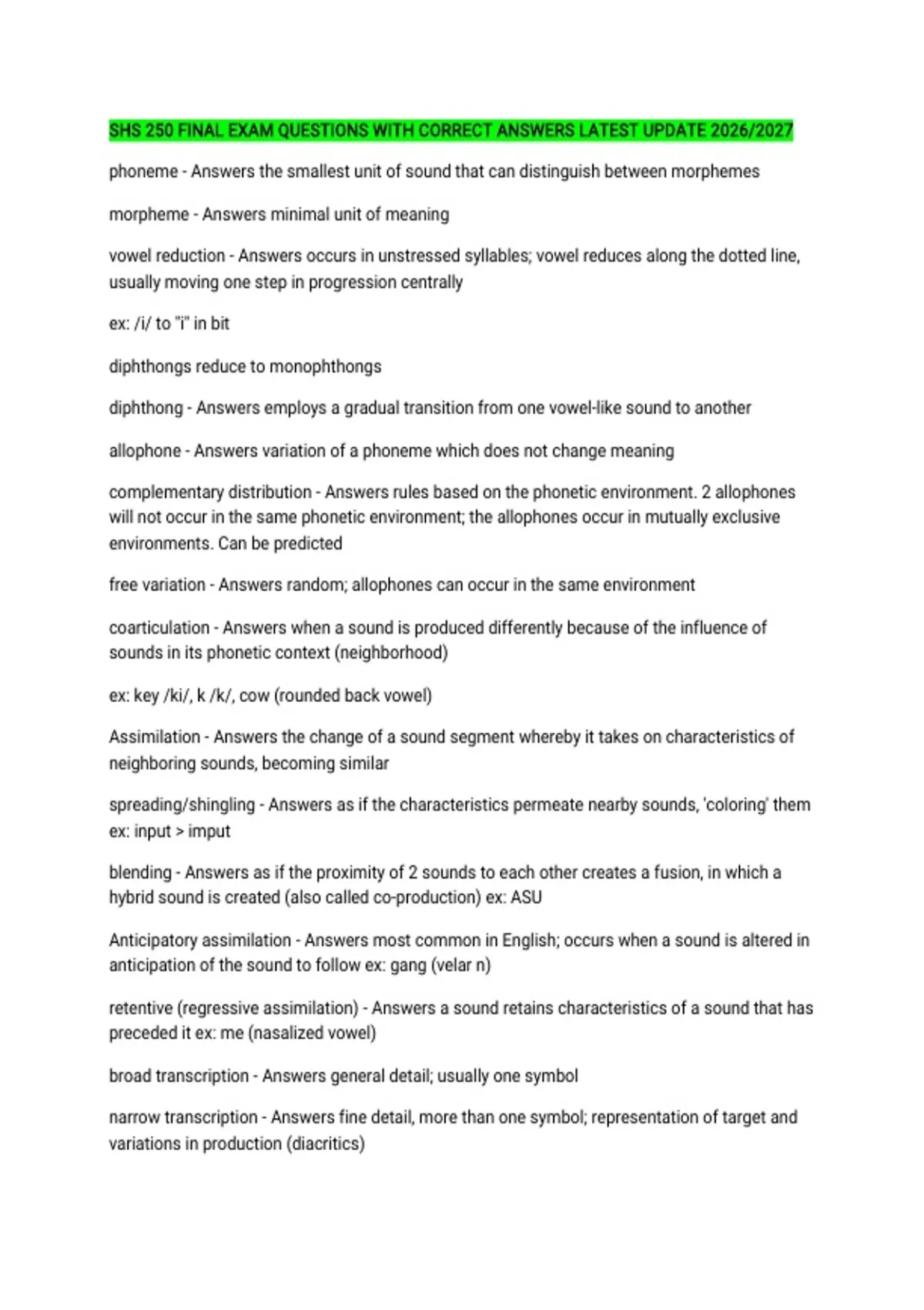 SHS 250 FINAL EXAM QUESTIONS WITH CORRECT ANSWERS LATEST UPDATE 2026/2027