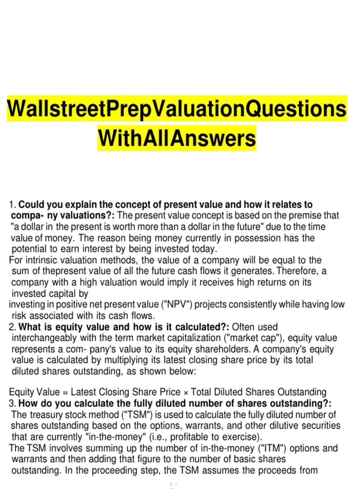 WALLSTREET PREP VALUATION QUESTIONS WITH ALL ANSWERS
