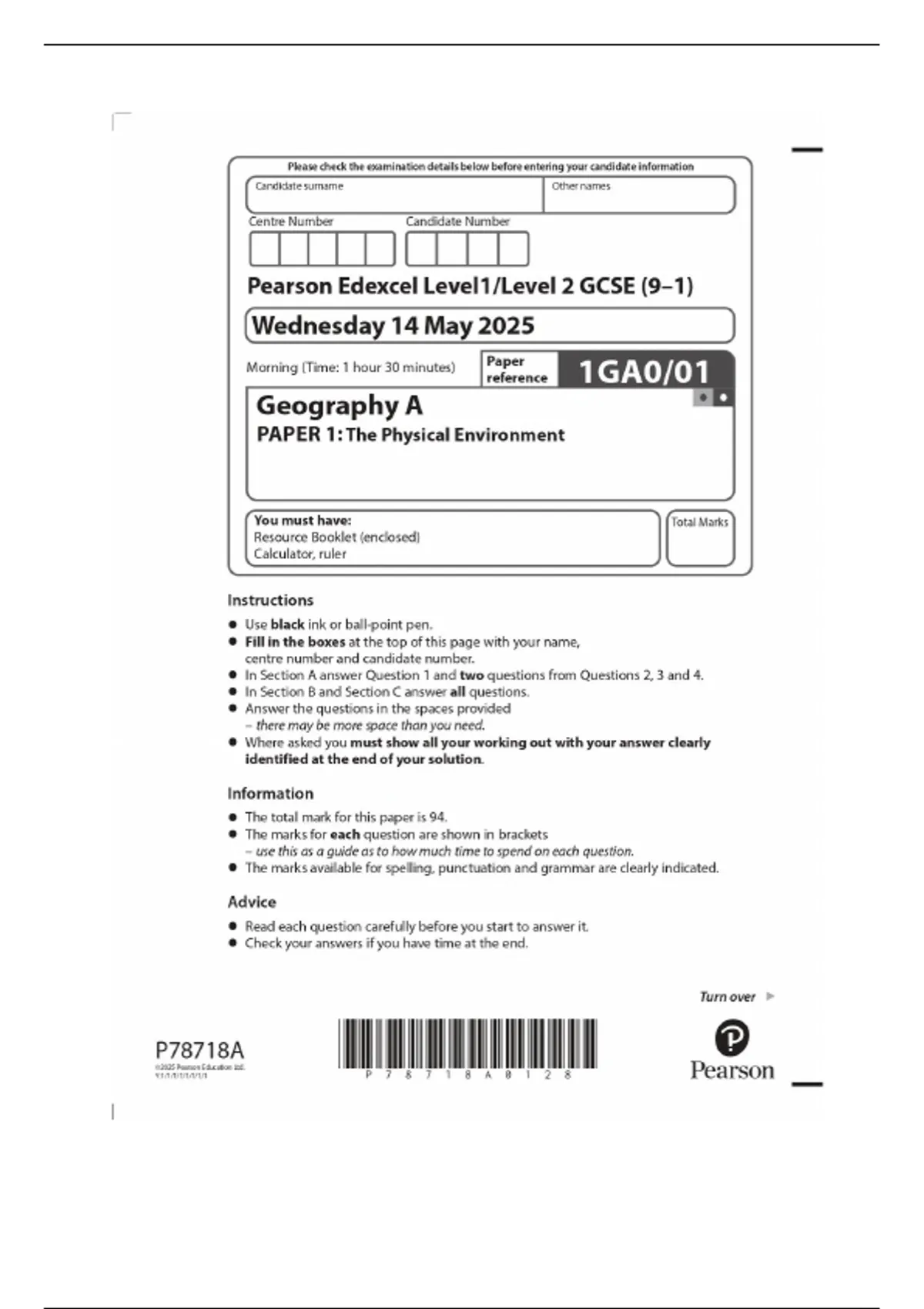 GCSE Edexcel Geography A Paper 1 – 2025 Exam MERGED WITH MARK SCHEME
