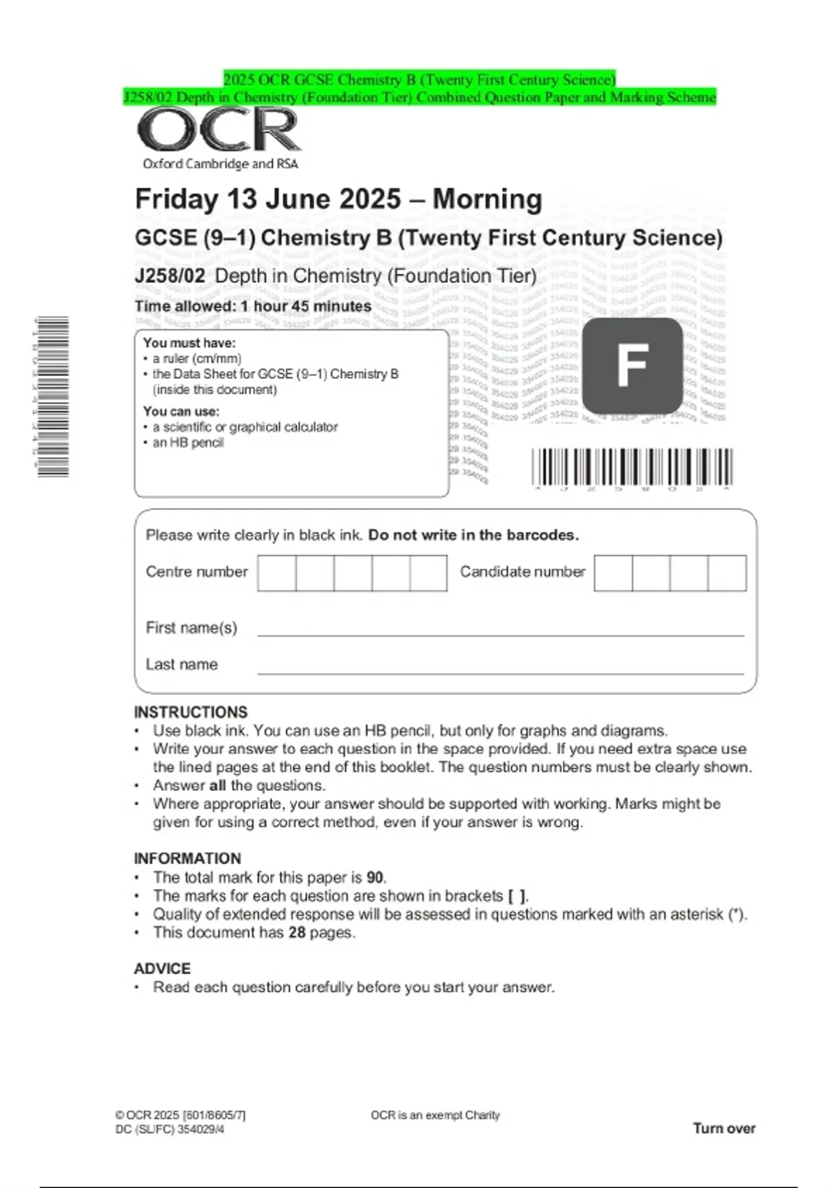 2025 OCR GCSE Chemistry B (Twenty First Century Science) J258/04 Depth in Chemistry (Higher Tier) Combined Question Paper and Marking Scheme 2 Exam (elaborations) 2025 OCR GCSE Chemistry B (Twenty First Century Science) J258/01 Breadth in Chemistry (Foundation Tier) Combined Question Paper and Marking Scheme 3 Exam (elaborations) 2025 OCR GCSE Ch
