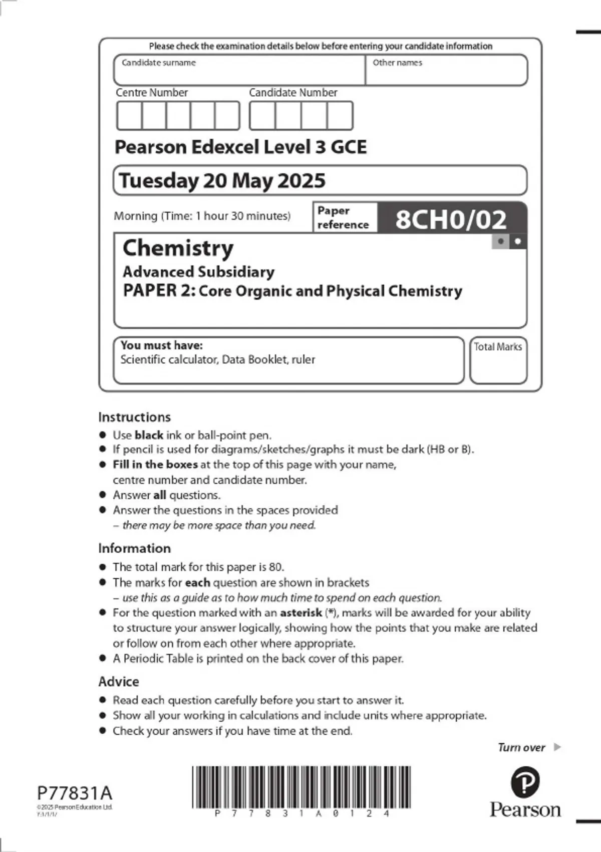 AS-LEVEL EDEXCEL 2025 CHEMISTRY PAPER 2 8CH0/02 QUESTION PAPER