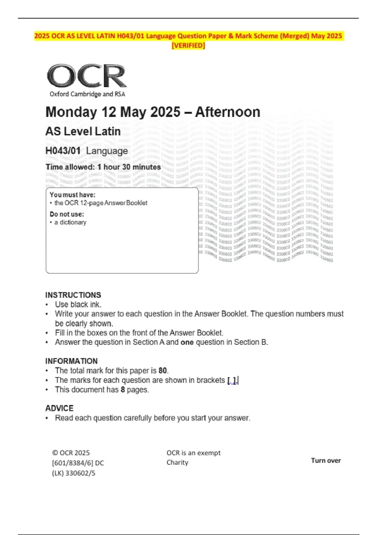 This verified bundle includes both May 2025 OCR AS Level Latin (H043) exam papers — Paper 1: Language and Paper 2: Literature — provided as merged question papers with official mark schemes. A complete and reliable resource for AS-level Latin exam revision, translation practice, and literature analysis.