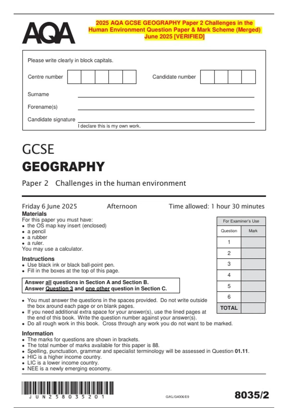 June 2025 AQA GCSE Geography | Papers 1, 2 & 3 Combined Question Papers & Mark Schemes