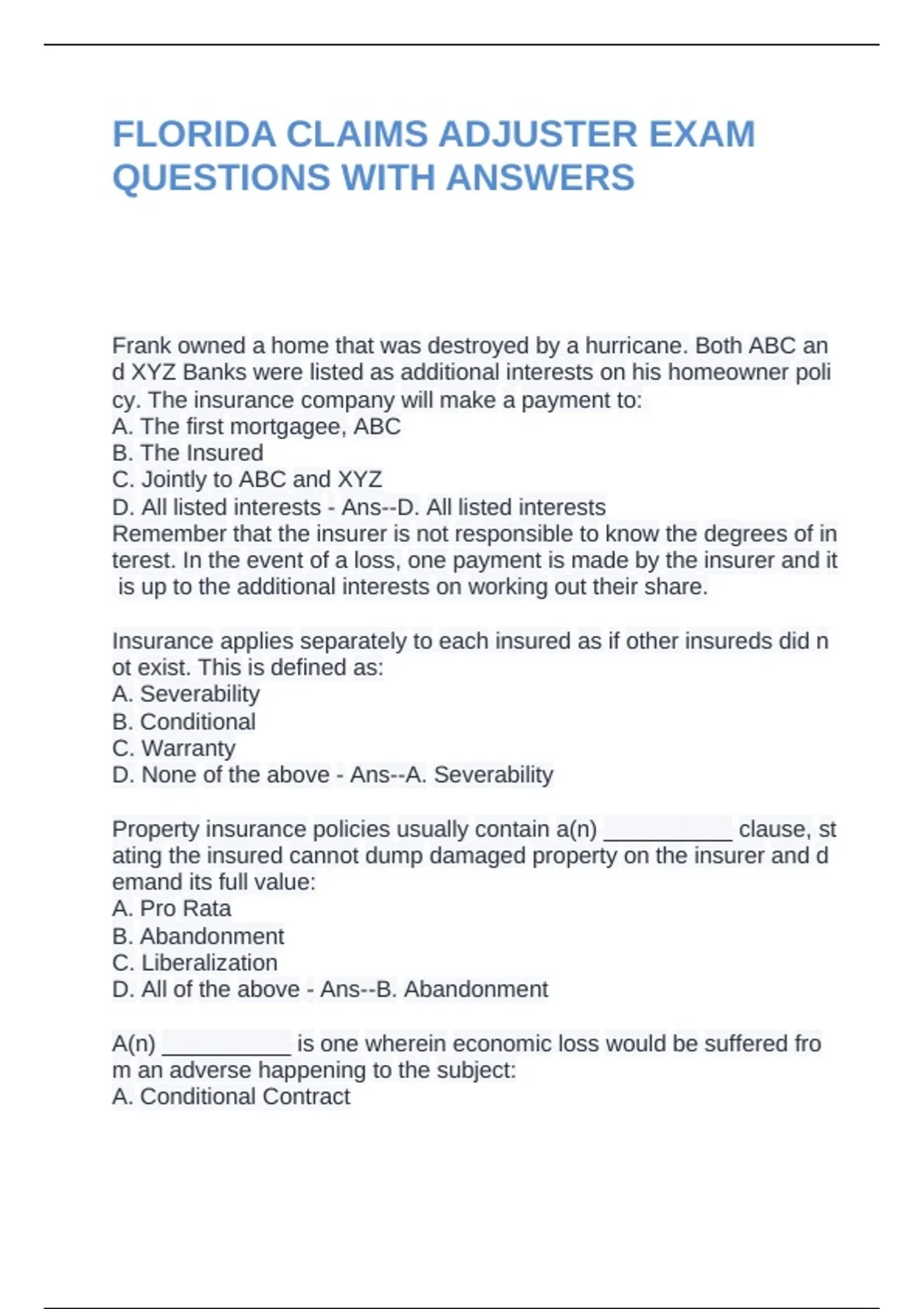 FLORIDA CLAIMS ADJUSTER EXAM QUESTIONS WITH ANSWERS