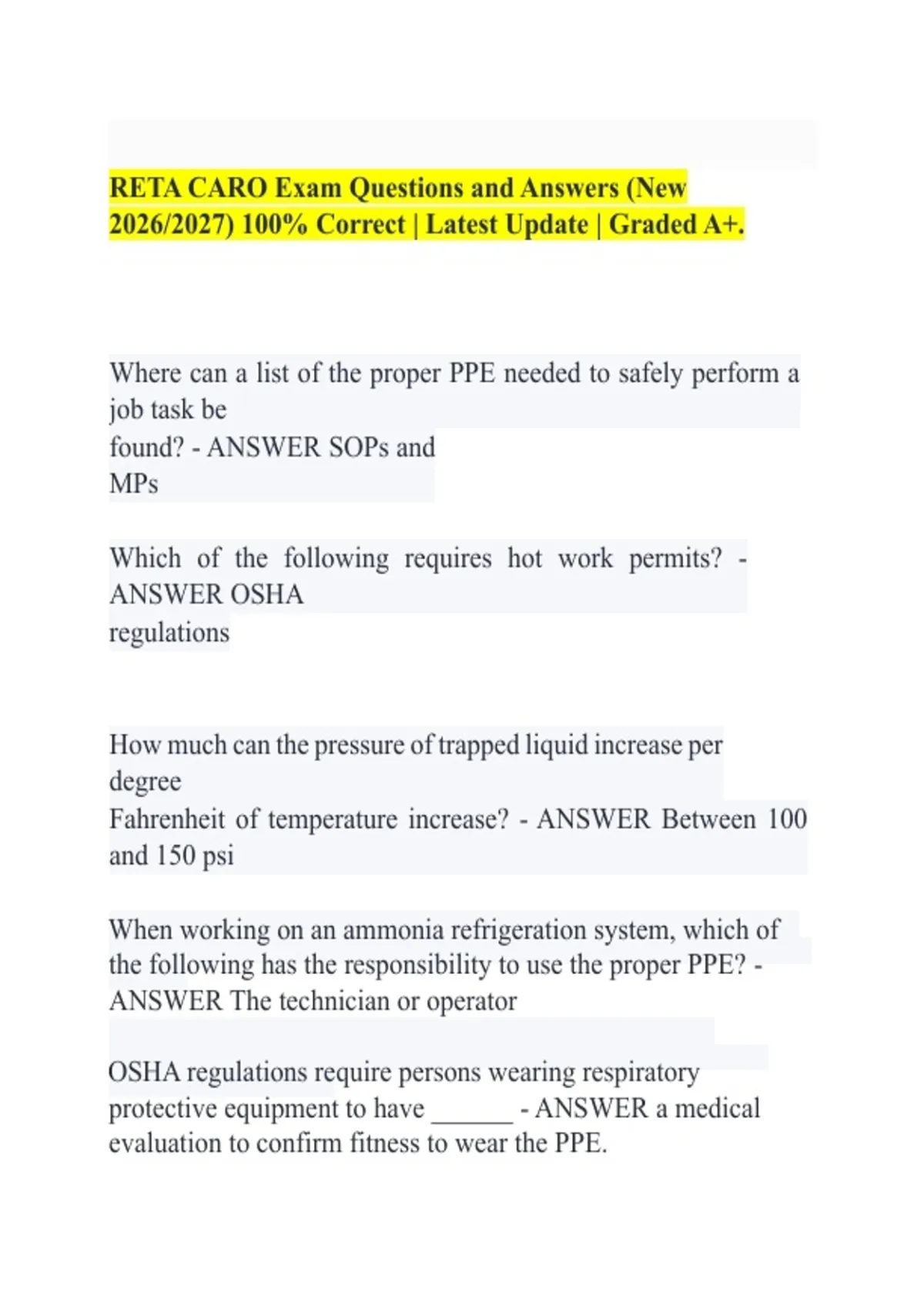 RETA CARO Certification Exam (Certified Assistant Refrigeration Operator) Practice Exam Questions And Correct Answers | RETA CARO TEST EXAM | NEWEST ACTUAL EXAM QUESTIONS AND VERIFIED ANSWERS | RETA CARO TEST EXAM 2026/2027 ACTUAL QUESTIONS AND CORRECT AN