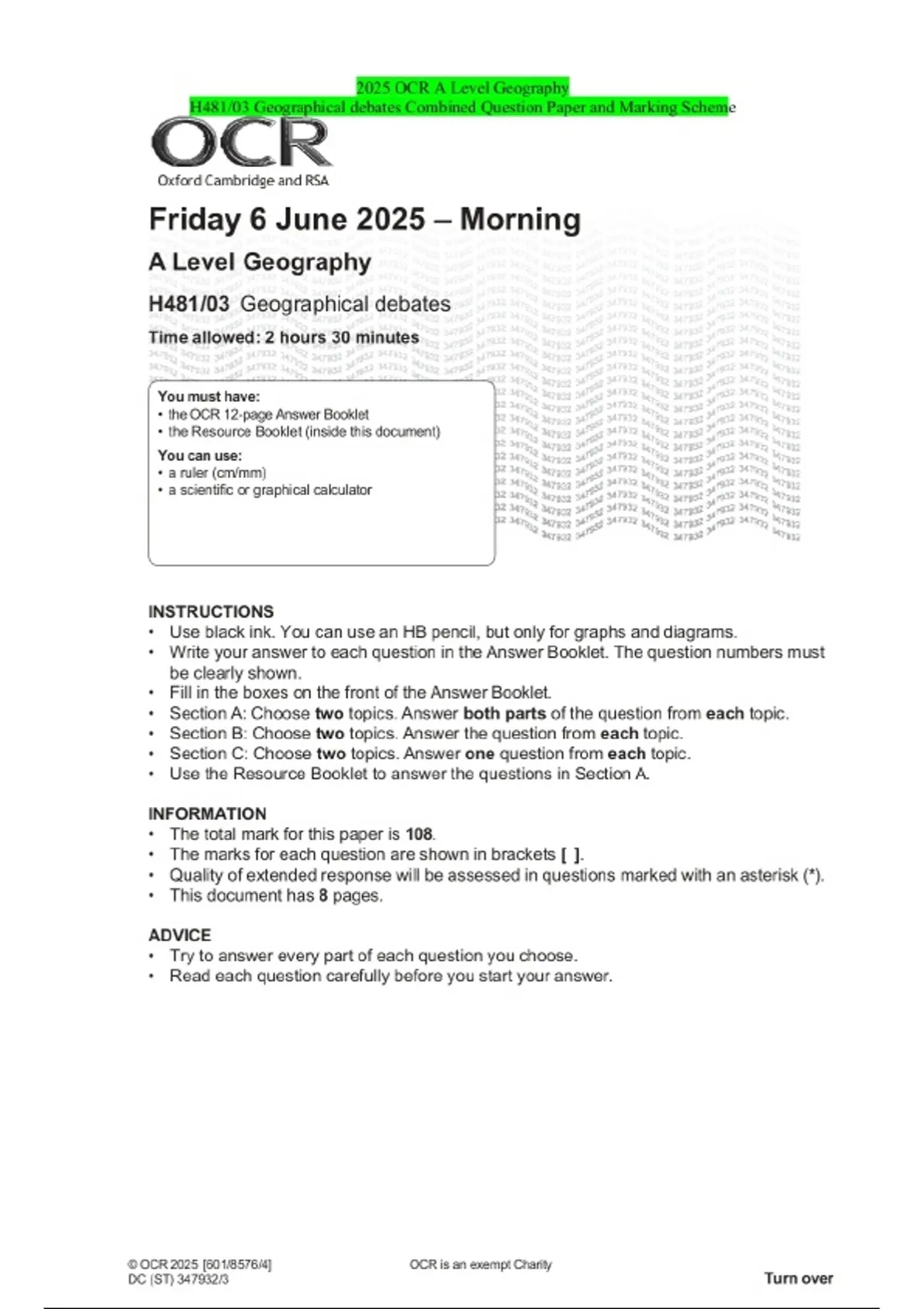 PACKAGE DEAL-::2025 OCR A Level|AS Level Geography Exams|Combined Question Paper and Final Marking Scheme