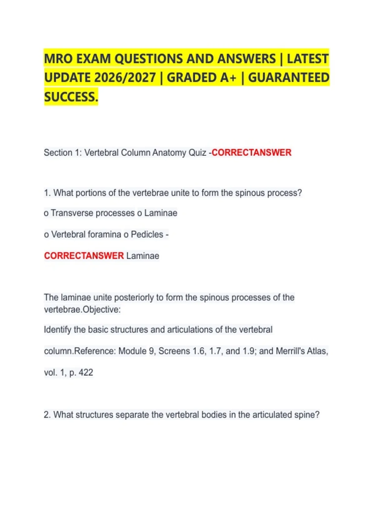 MRO EXAM QUESTIONS AND ANSWERS | LATEST UPDATE 2026/2027 GRADED A+ | MRO Exam Practice Questions with 100% Verified Answers & MRO Exam Practice Questions with 100% Correct Answers | Latest Update 2026/2027 | Graded A+ | Guaranteed Pass.