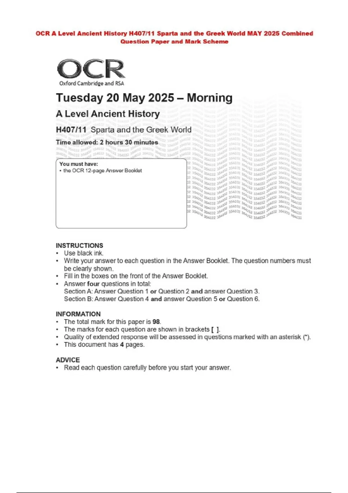 OCR A Level Ancient History H407/11 Sparta and the Greek World MAY 2025 Combined Question Paper and Mark Scheme