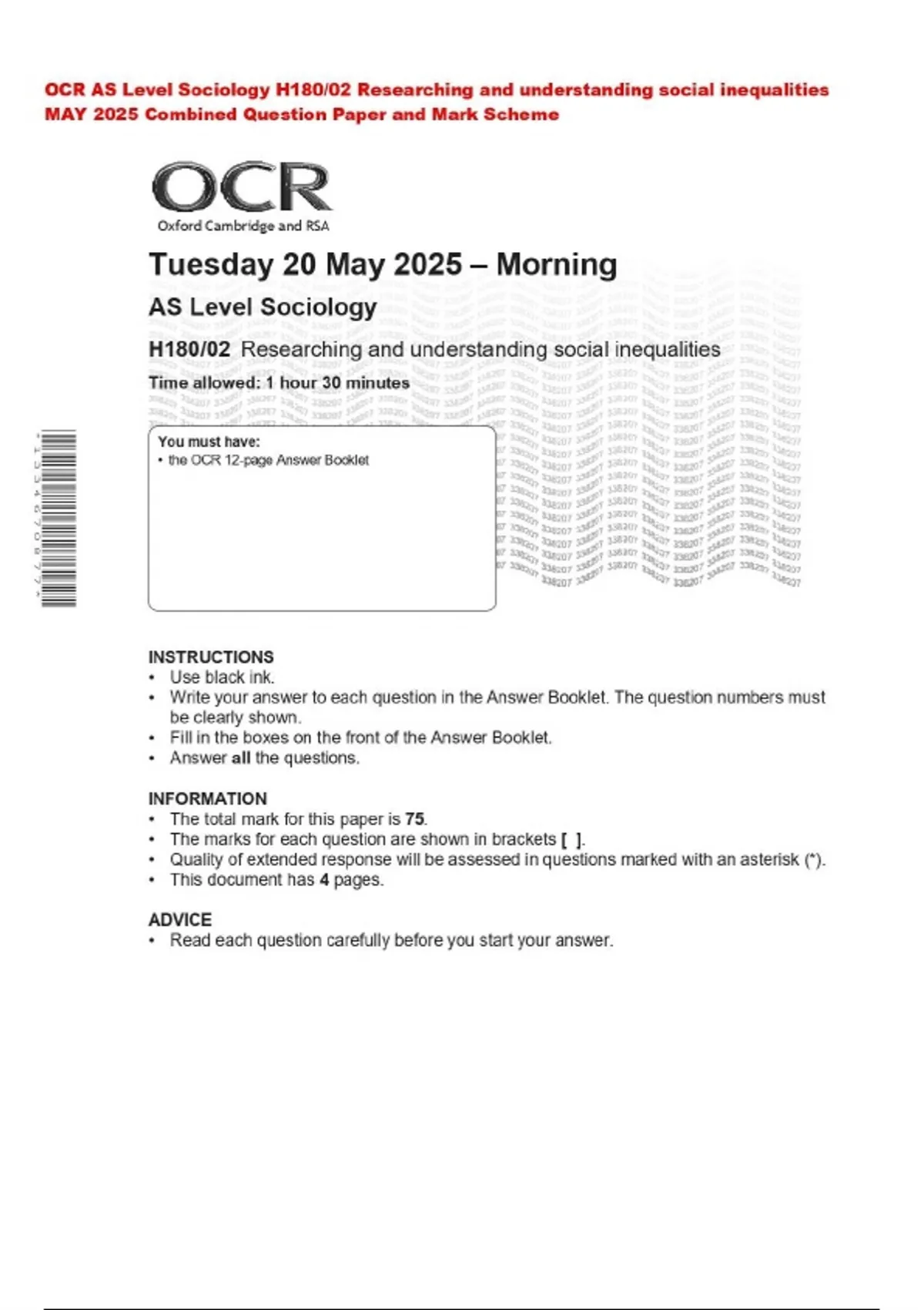 OCR AS Level Sociology H180/02 Researching and understanding social inequalities MAY 2025 Combined Question Paper and Mark Scheme