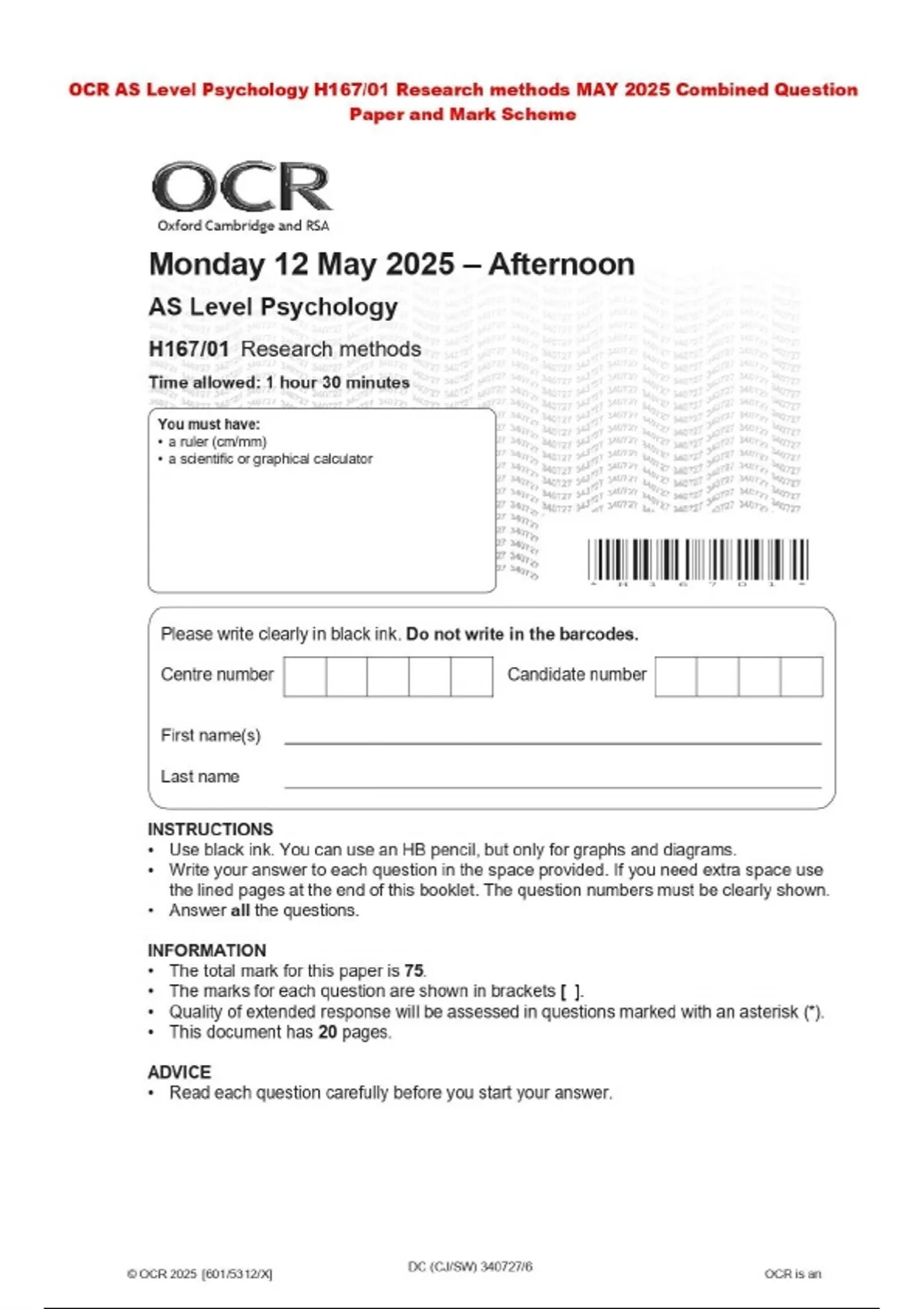 OCR AS Level Psychology H167/01 Research methods MAY 2025 Combined Question Paper and Mark Scheme