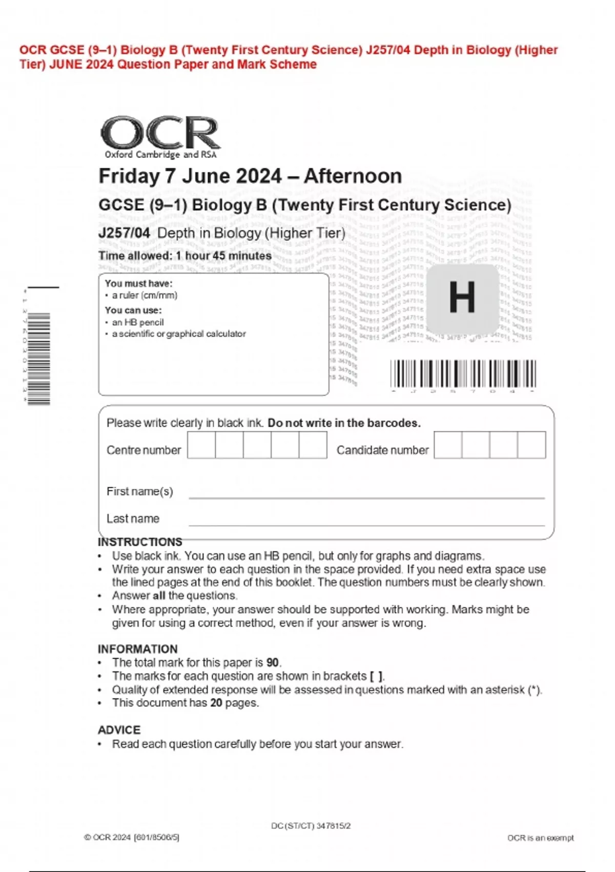 OCR GCSE (9–1) Biology B (Twenty First Century Science) J257/04 Depth in Biology (Higher Tier) JUNE 2024 Question Paper and Mark Scheme