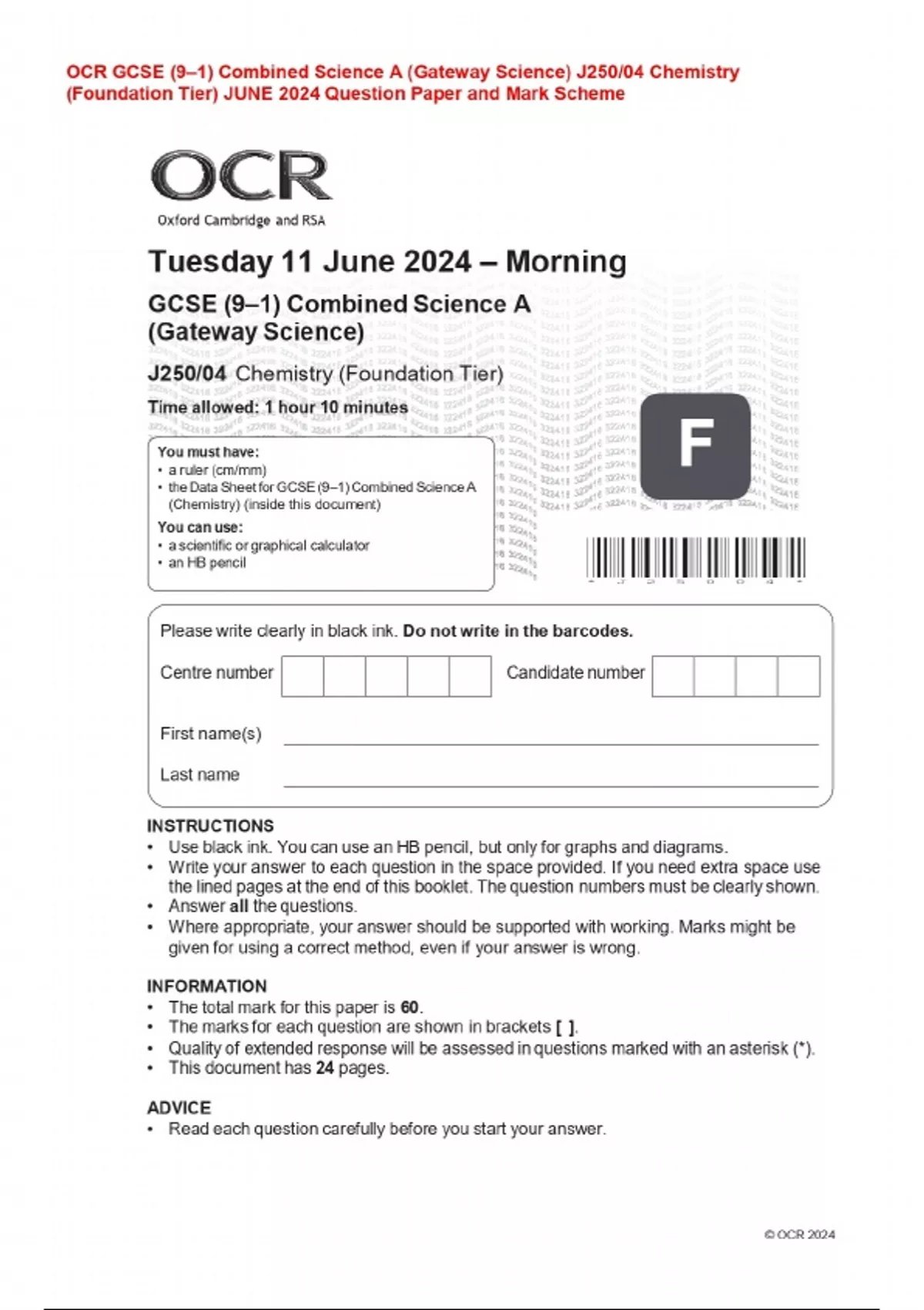BUNDLE ::: OCR GCSE (9–1) Combined Science Question Paper with Mark Scheme / 2025