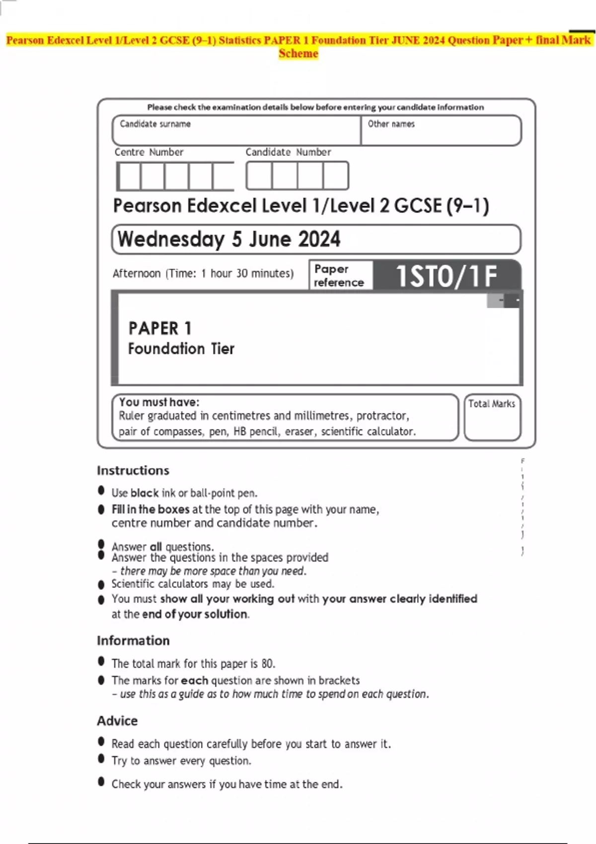 Pearson Edexcel Level 1/Level 2 GCSE (9–1) Statistics PAPER 1 Foundation Tier JUNE 2024 Question Paper + final Mark Scheme