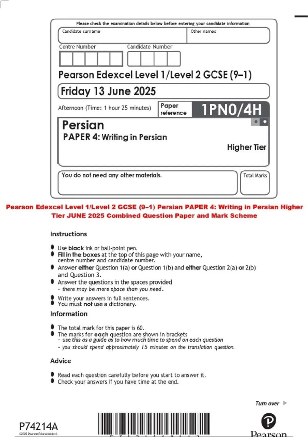 Pearson Edexcel Level 1/Level 2 GCSE (9–1) Persian PAPER 4: Writing in Persian Higher Tier JUNE 2025 Combined Question Paper and Mark Scheme