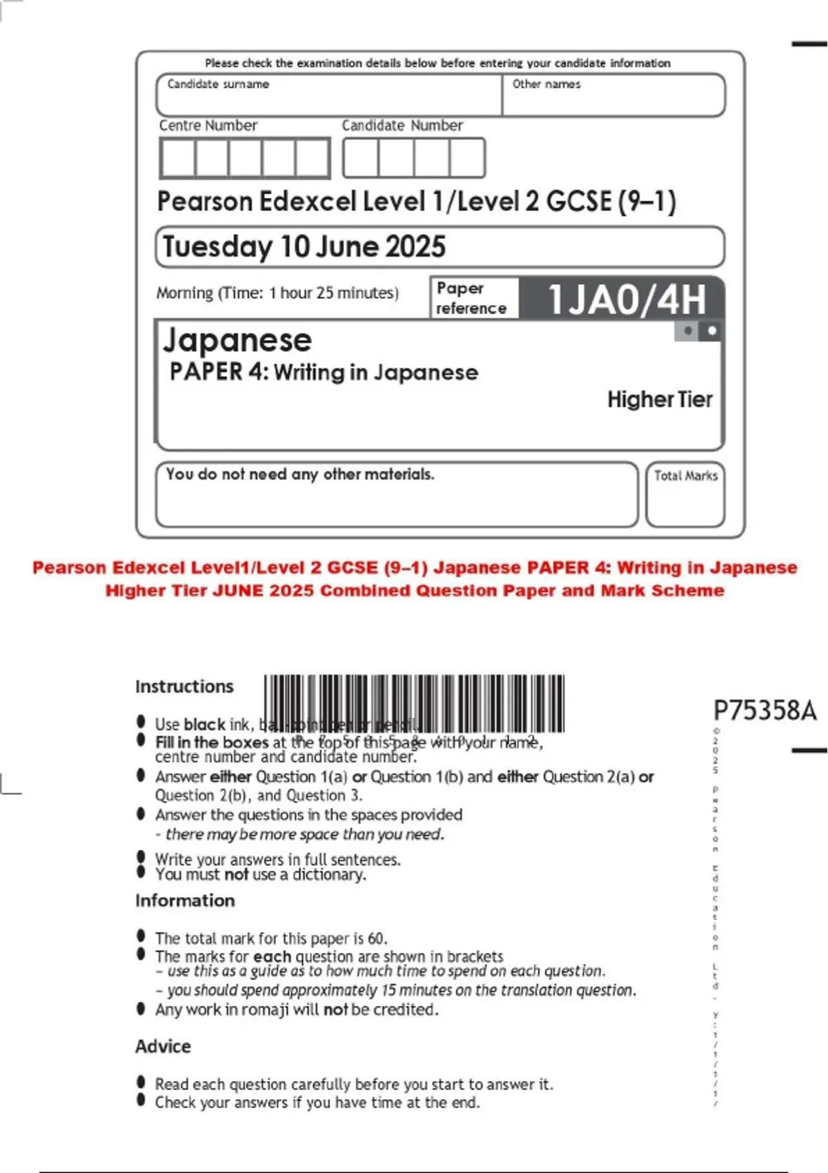 Pearson Edexcel Level1/Level 2 GCSE (9–1) Japanese PAPER 4: Writing in Japanese Higher Tier JUNE 2025 Combined Question Paper and Mark Scheme