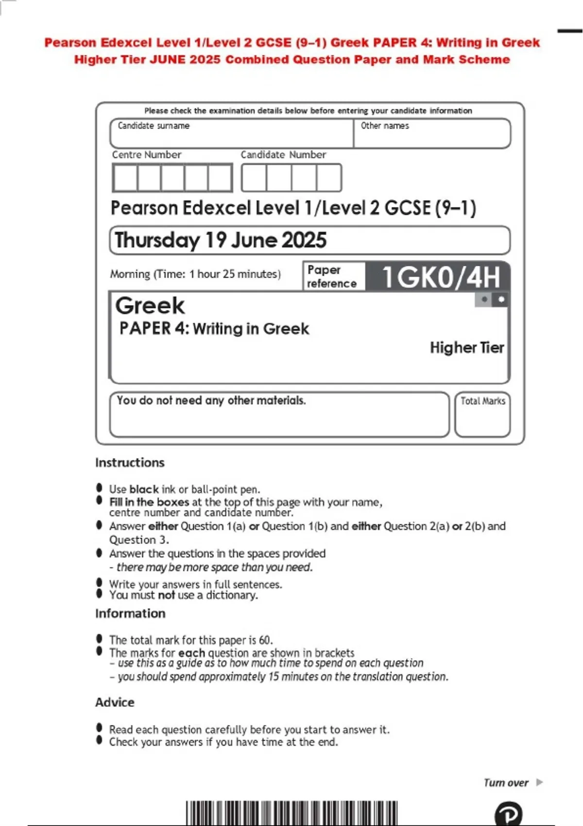 Pearson Edexcel Level 1/Level 2 GCSE (9–1) Greek PAPER 4: Writing in Greek Higher Tier JUNE 2025 Combined Question Paper and Mark Scheme