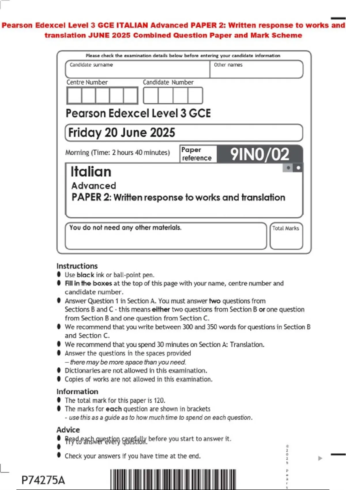 BUNDLE ::: Pearson Edexcel Level 3 GCE Italian Question Paper with Mark Scheme / 2025