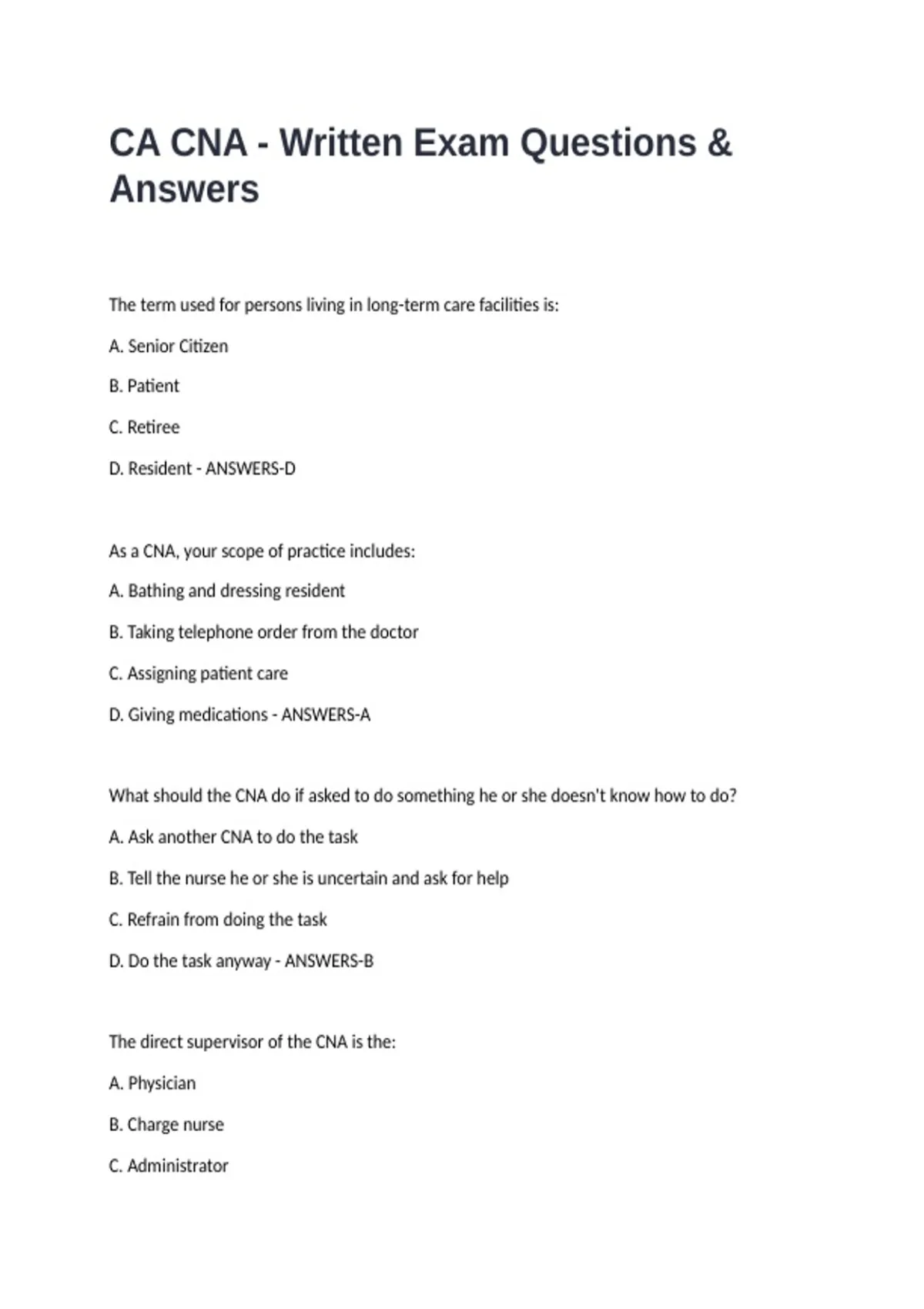 CA CNA - Written Exam Questions & Answers