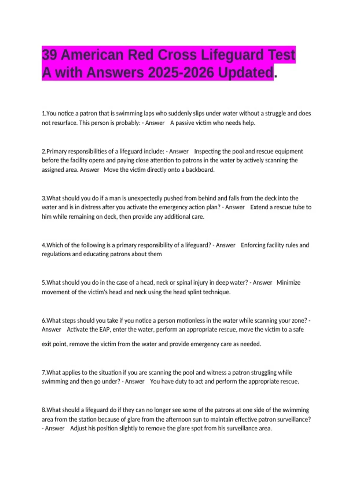 Red Cross Lifeguard test with Answers Updated