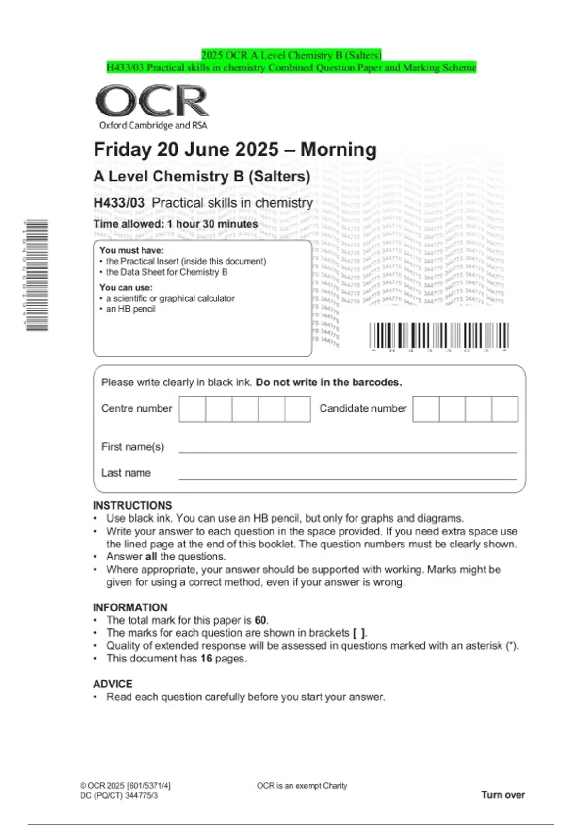 2025 OCR A Level Chemistry B (Salters) H433/03 Practical skills in chemistry Combined Question Paper and Marking Scheme 2 Exam (elaborations) 2025 OCR AS Level Chemistry B (Salters) H033/01 Foundations of chemistry Combined Question Paper and Marking Scheme 3 Exam (elaborations) 2025 OCR AS Level Chemistry B (Salters) H033/02 Chemistry in depth C