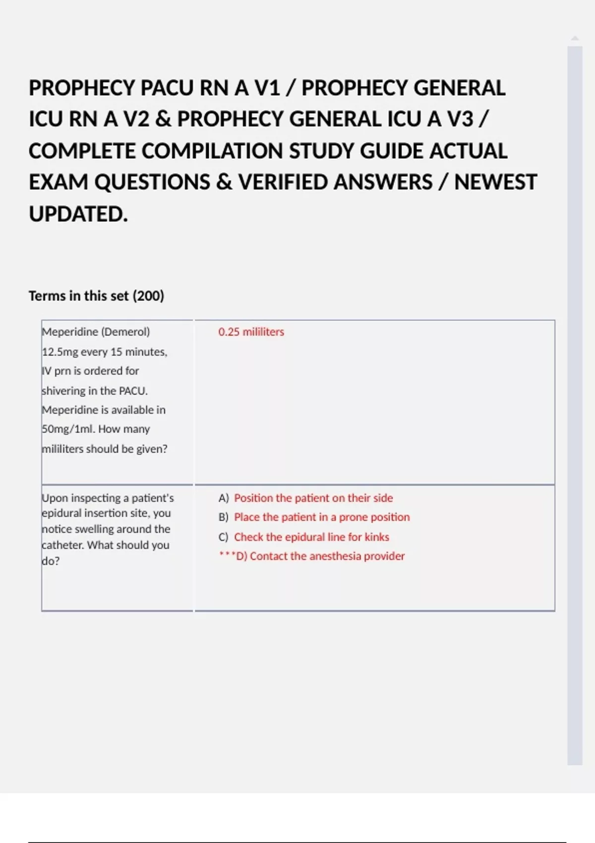 PROPHECY PACU RN A V1 / PROPHECY GENERAL ICU RN A V2 & PROPHECY GENERAL ICU A V3 / COMPLETE COMPILATION STUDY GUIDE ACTUAL EXAM QUESTIONS & VERIFIED ANSWERS BUNDLE