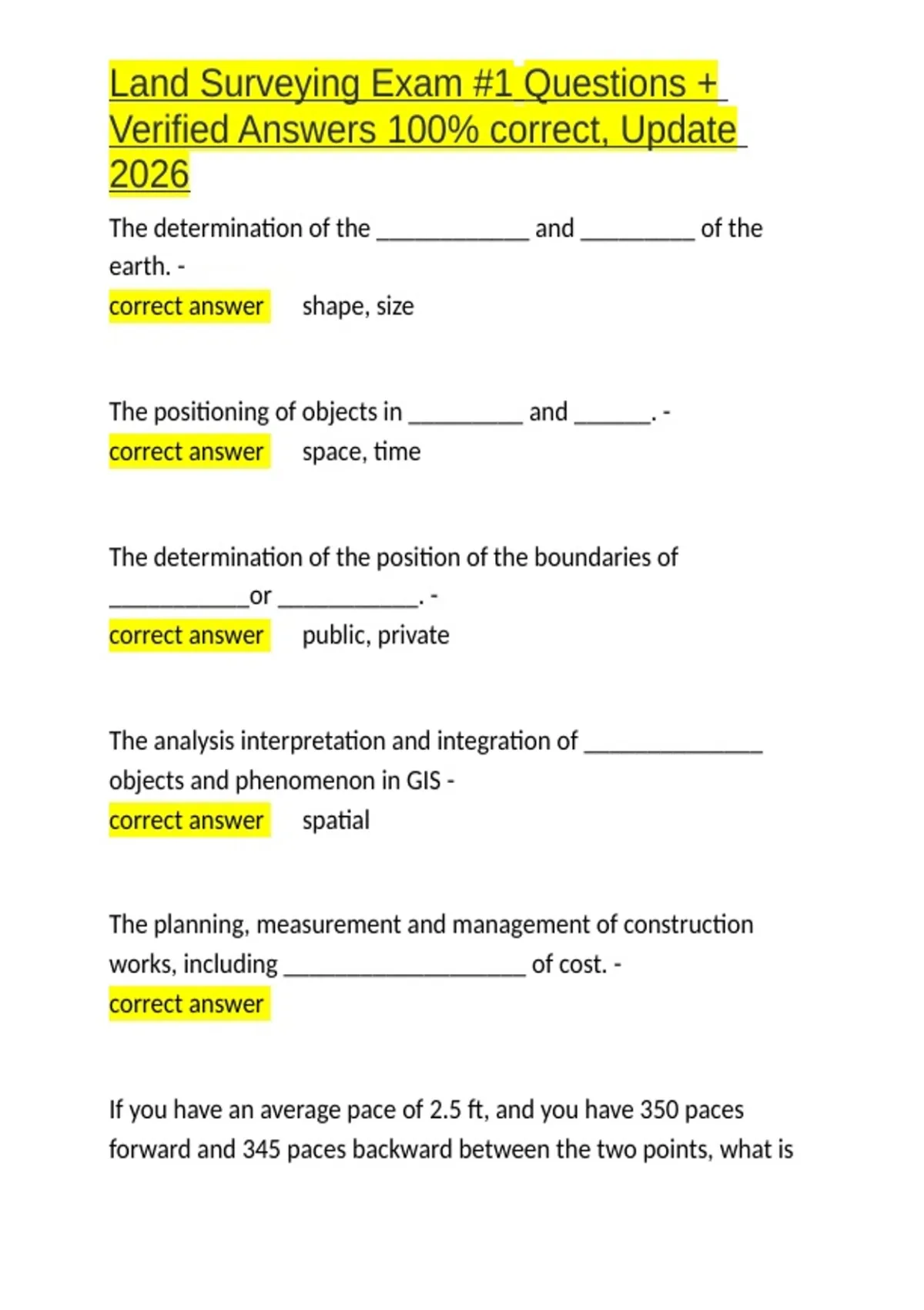 Land Surveying 301 Exam Questions + Verified Answers 100- correct, Update 2026.docx TSSE (Texas State Specific Exam) for Land Surveying Cases Exam Questions + Verified Answers 100- correct, Update 2026.docx Land Surveying and Property Law Key Concepts and Techniques Exam Questions + Verified Answers 100- correct, Update 2026.docx Public Land Survey