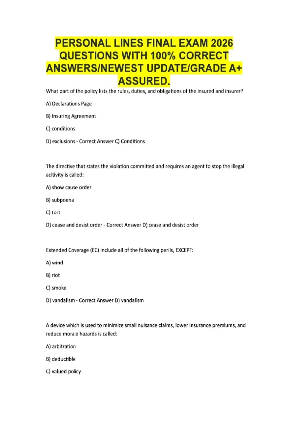 Personal Lines Property & Casualty Exam Questions with Correct Answers