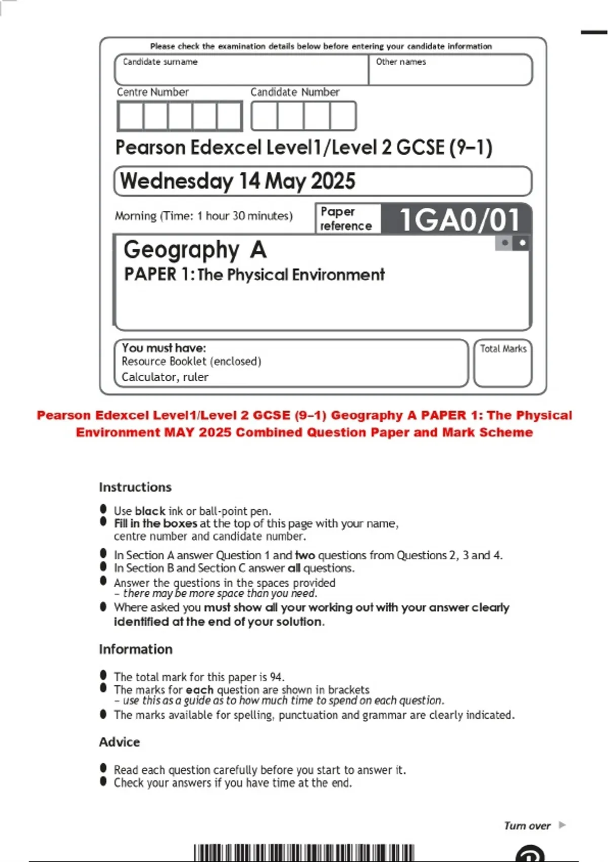 Pearson Edexcel Level1/Level 2 GCSE (9–1) Geography A PAPER 1: The Physical Environment MAY 2025 Combined Question Paper and Mark Scheme